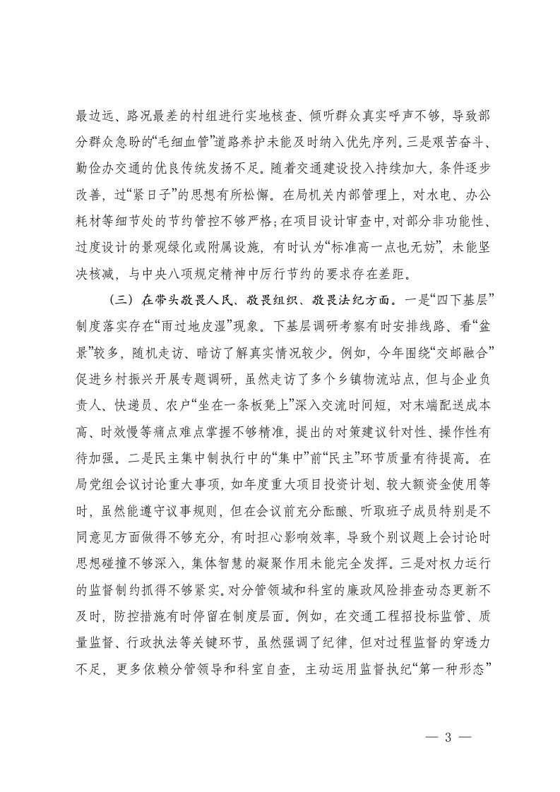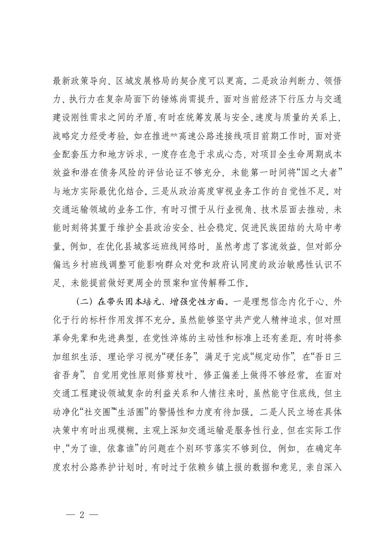 标题:交通运输局党组书记2025年度民主生活会个人对照检查材料五个带头