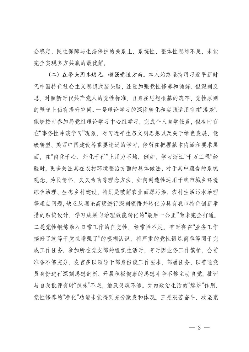 生态环境主管机关党组书记2025年度民主生活会个人五个带头对照检查发言提纲