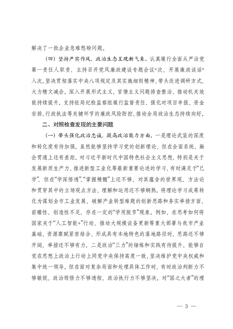 标题:市经信局党组书记2025年度民主生活会个人对照检查材料五个带头