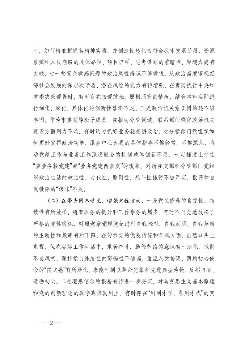 市委书记2025年度专题民主生活会个人对照检查材料五个带头