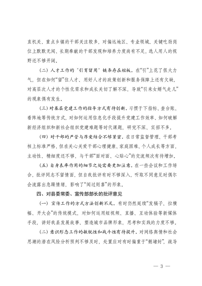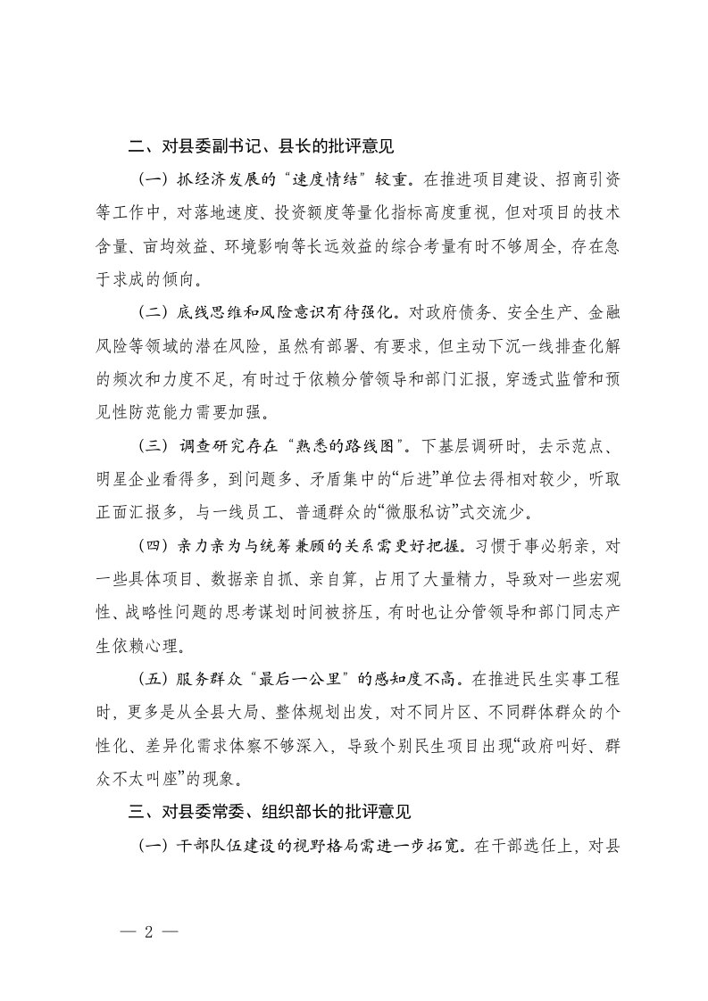 标题:县委常委班子2025年度民主生活会相互批评意见