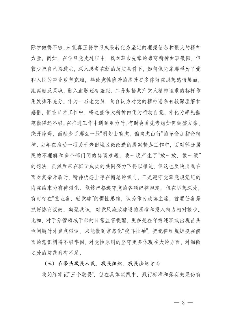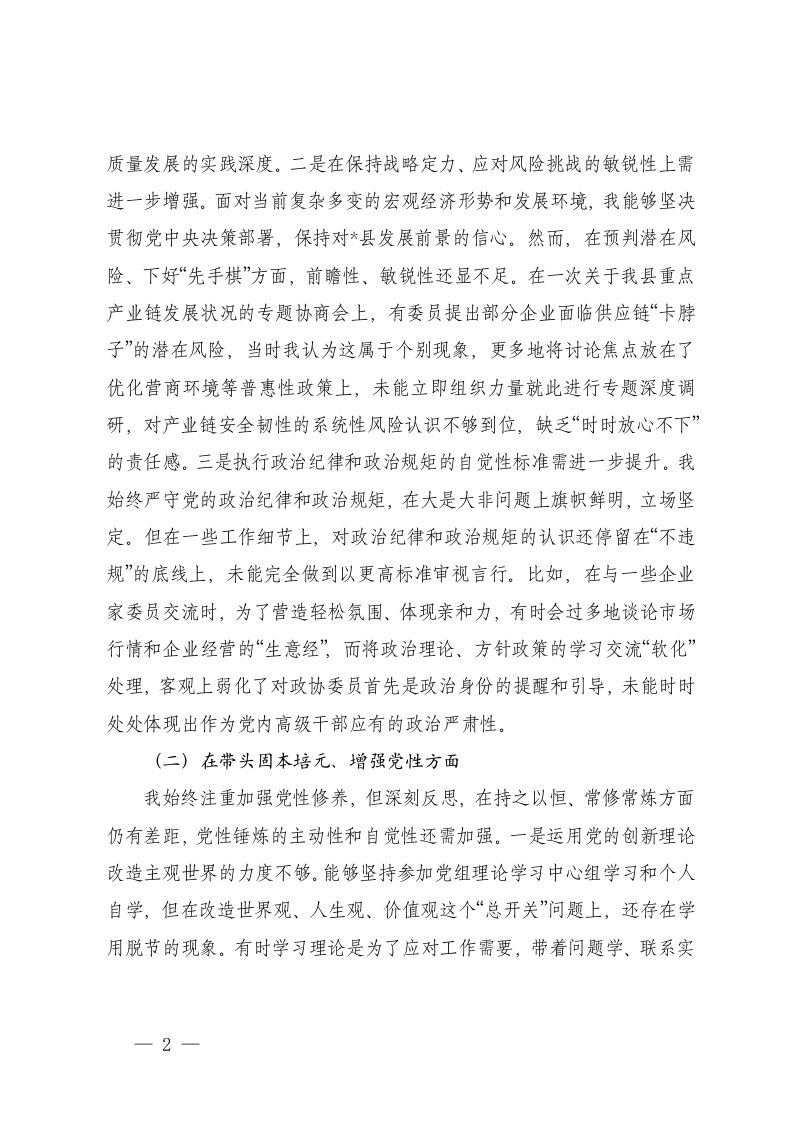标题:县政协主席2025年度民主生活会个人对照检查材料五个带头