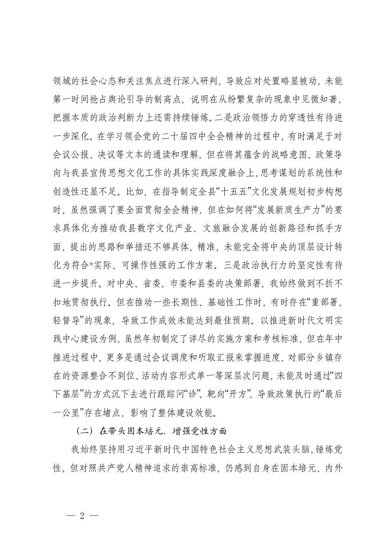 标题:宣传部领导干部2025年度民主生活会个人五个带头对照检查材料