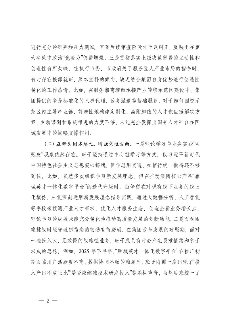 标题:2025年度公司民主生活会班子五个带头对照检查材料