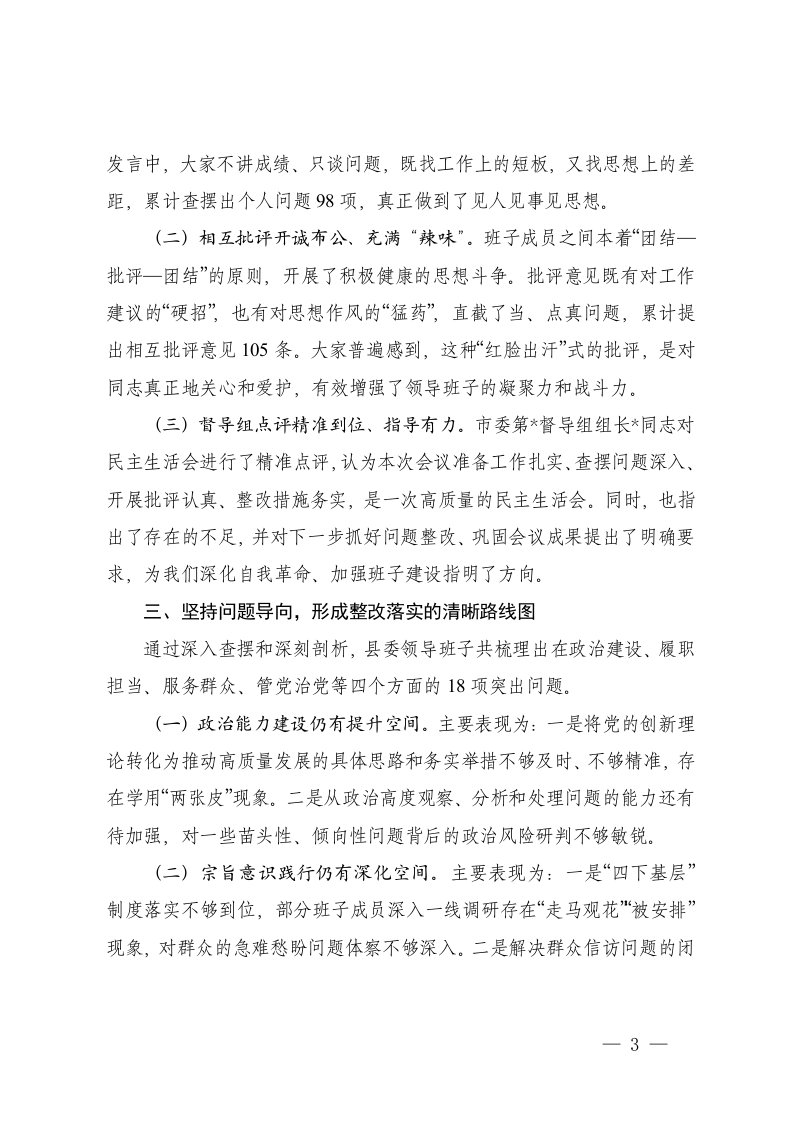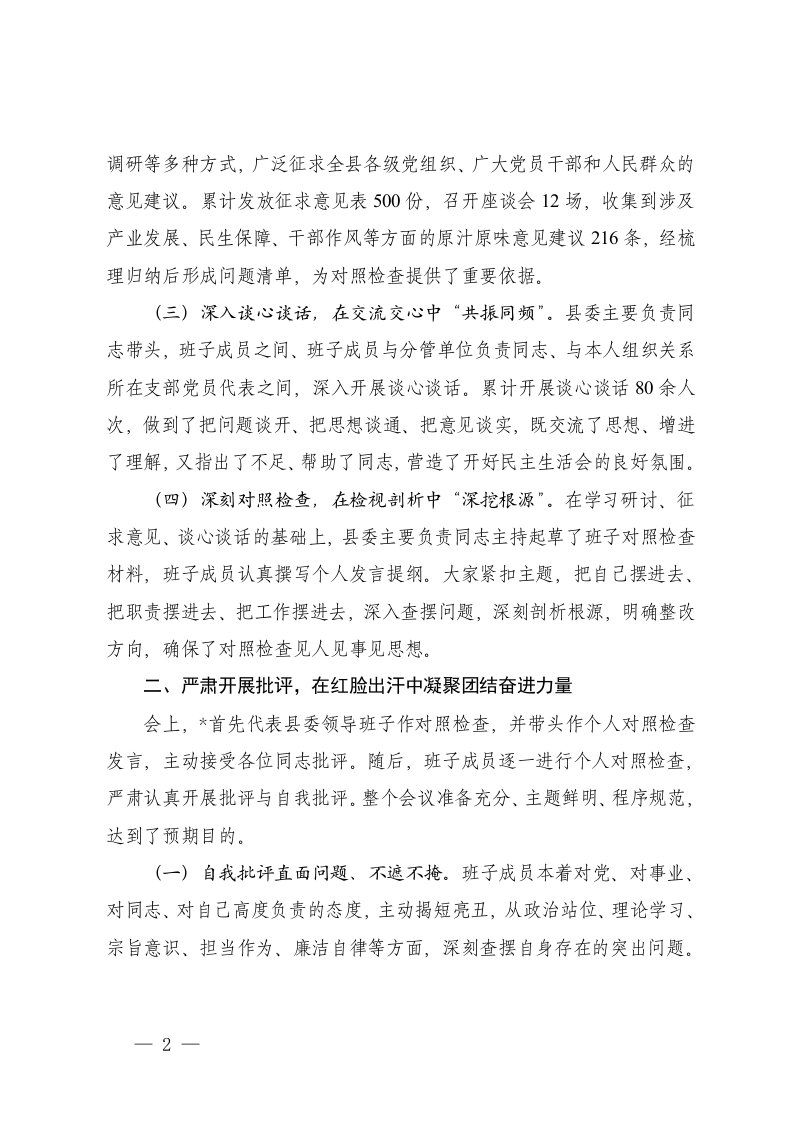 标题:2篇关于领导班子召开2025年度民主生活会的情况报告