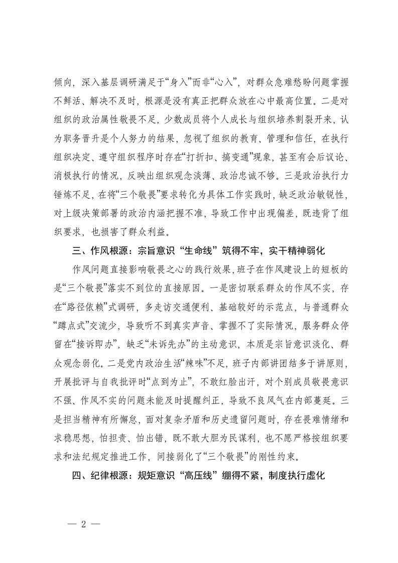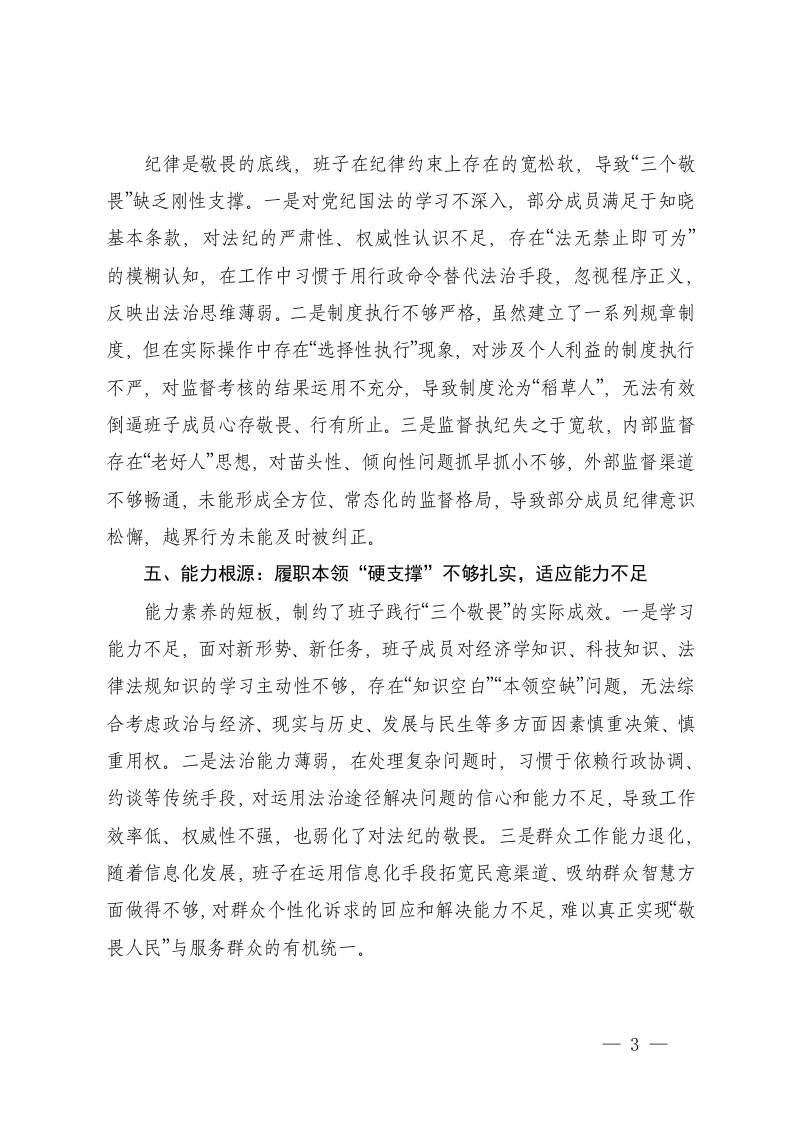 标题:2025年度班子带头敬畏人民敬畏组织敬畏法纪方面存在问题原因分析