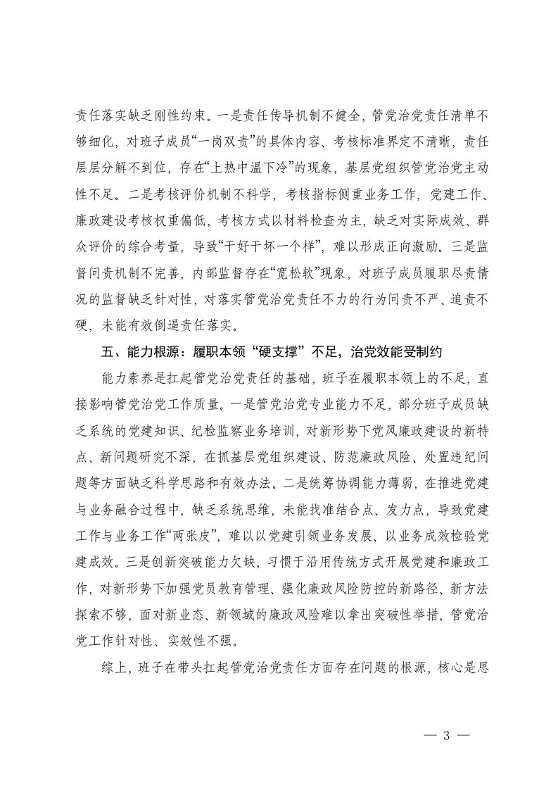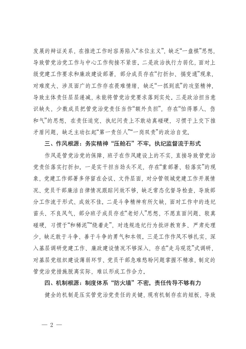 标题:2025年度班子在带头坚决扛起管党治党责任方面存在问题原因分析
