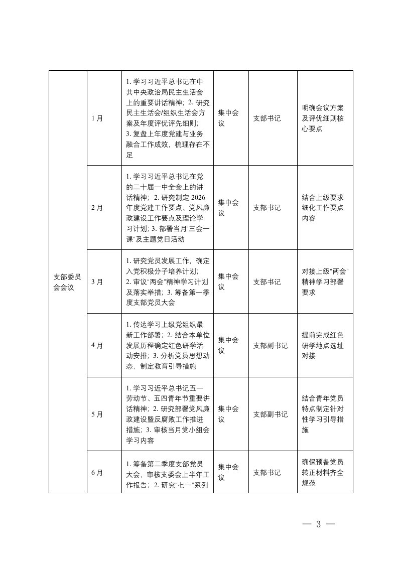 标题:2026年度三会一课计划表