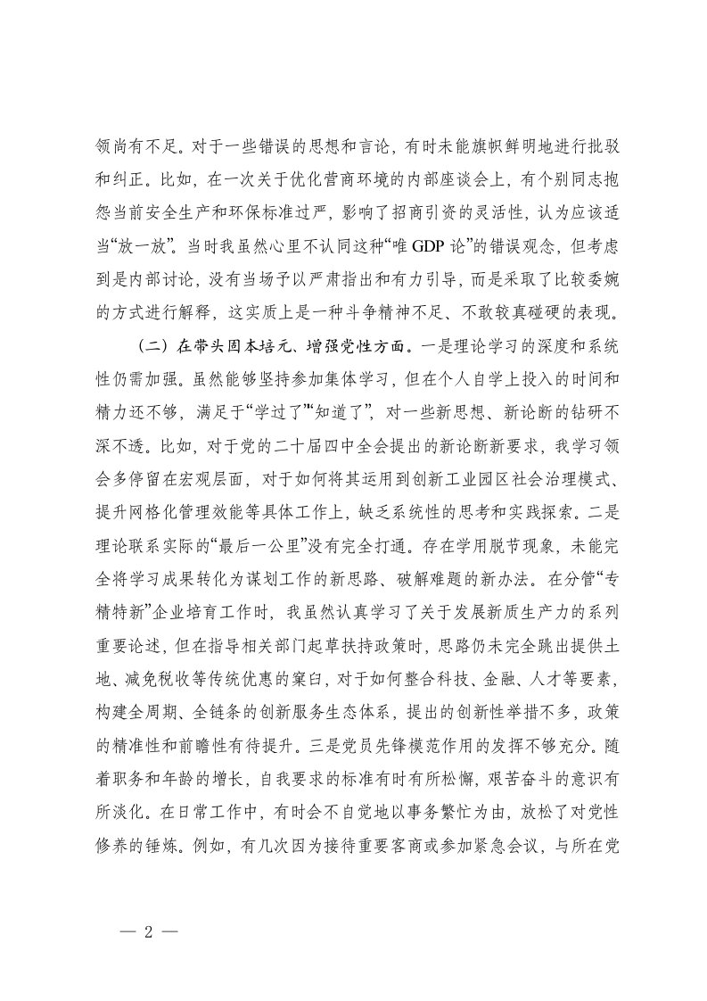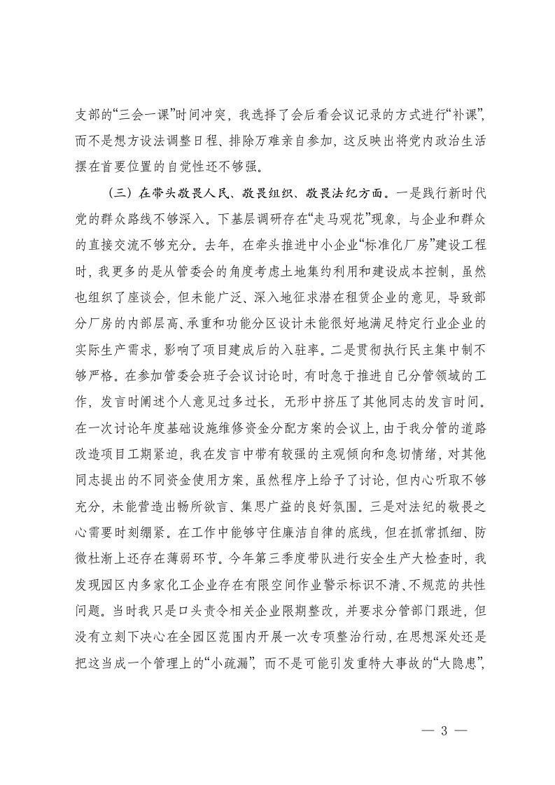 工业园管委会领导干部2025年度民主生活会个人五个带头对照检查材料文稿