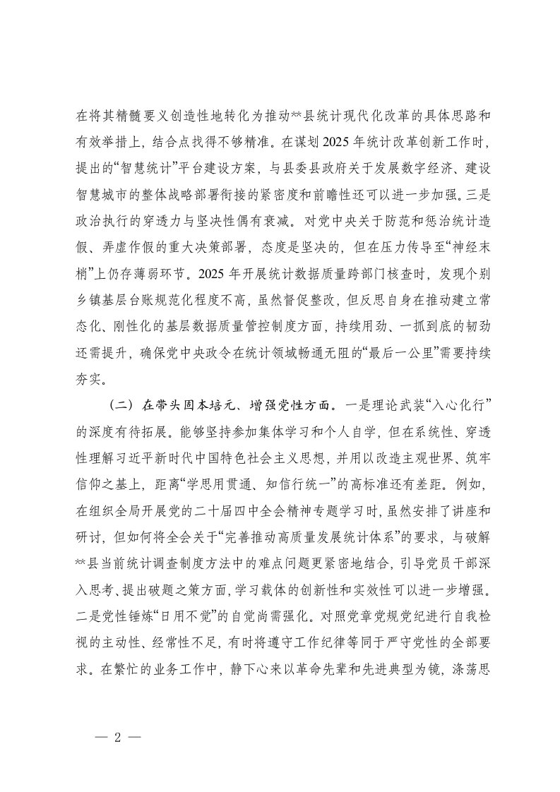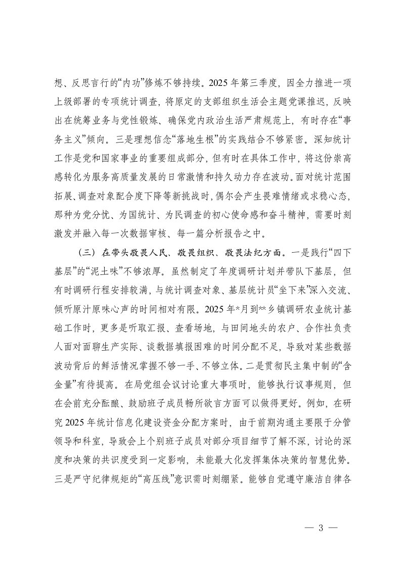 标题:统计机关党组书记2025年度民主生活会个人五个带头对照检查材料范文