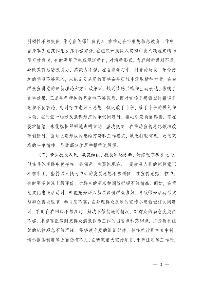 标题:宣传部部长2025年度民主生活会个人五个带头对照检查材料文稿