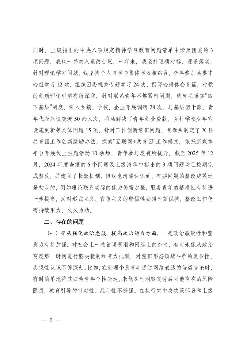 团委书记2025年度民主生活会五个带头对照检查材料含上一年度查摆问题整改情况整改情况及案例分析范文