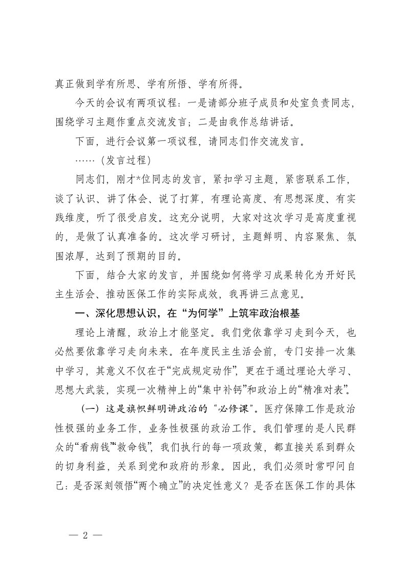 2025年度民主生活会会前学习研讨主持词在局党组理论学习中心组集体学习暨2025年度民主生活会会前学习研讨会上的主持词及总结讲话