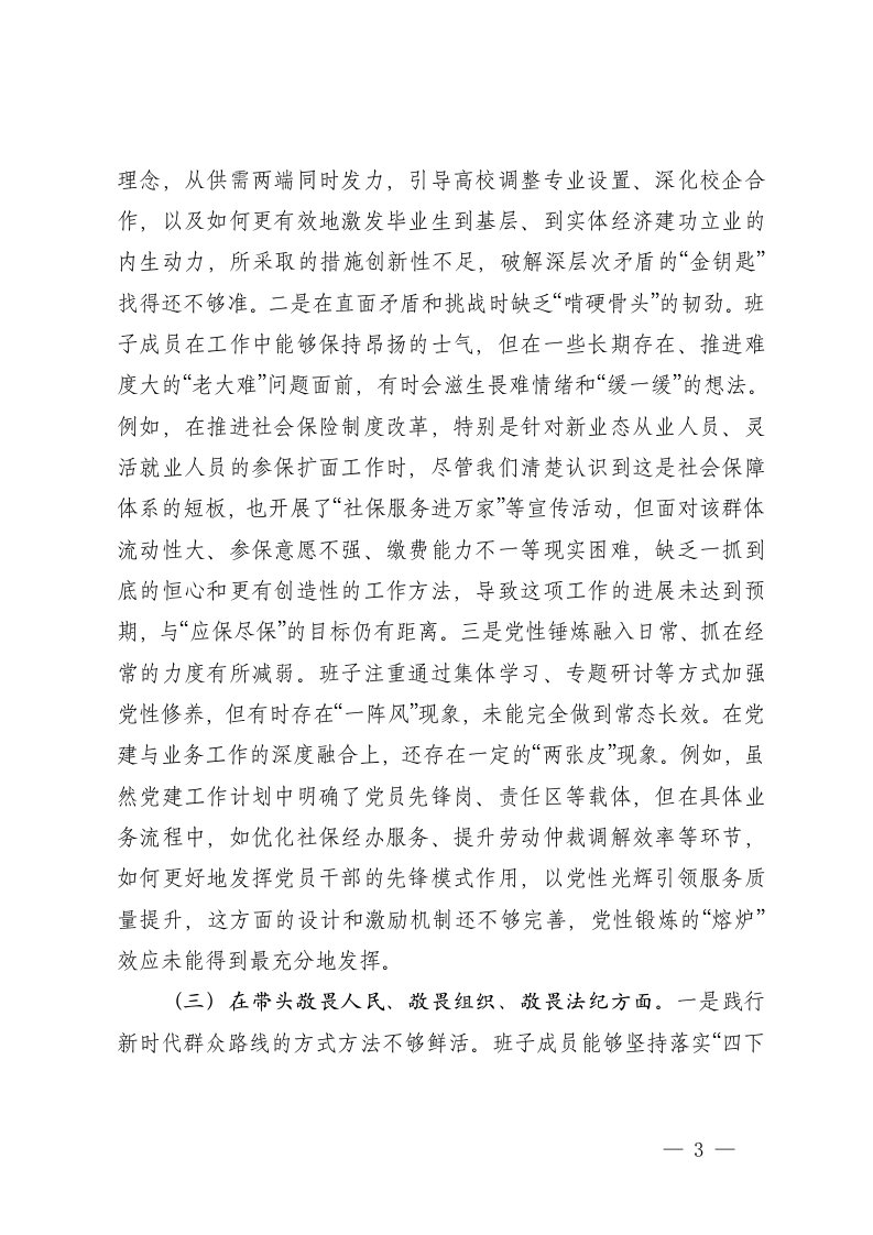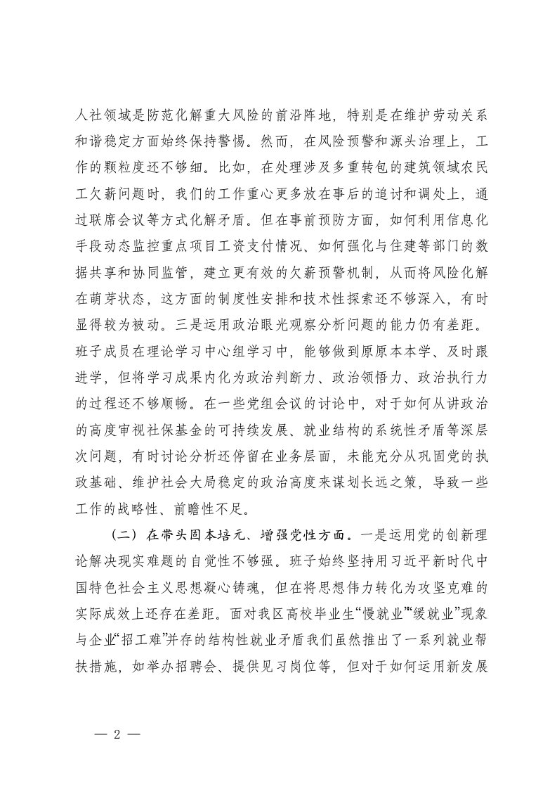 人力资源和社会保障部门领导班子2025年度民主生活会对照检查材料五个带头范文