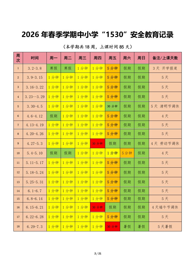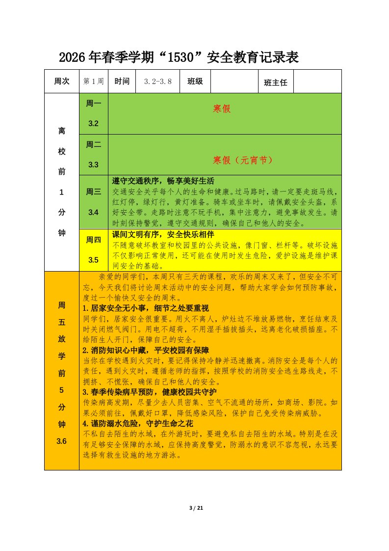 标题:可编辑打印2026年春季学期校园1530安全教育记录表