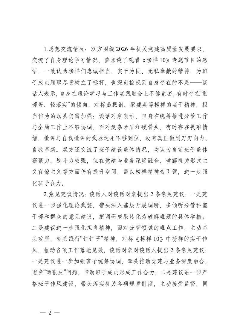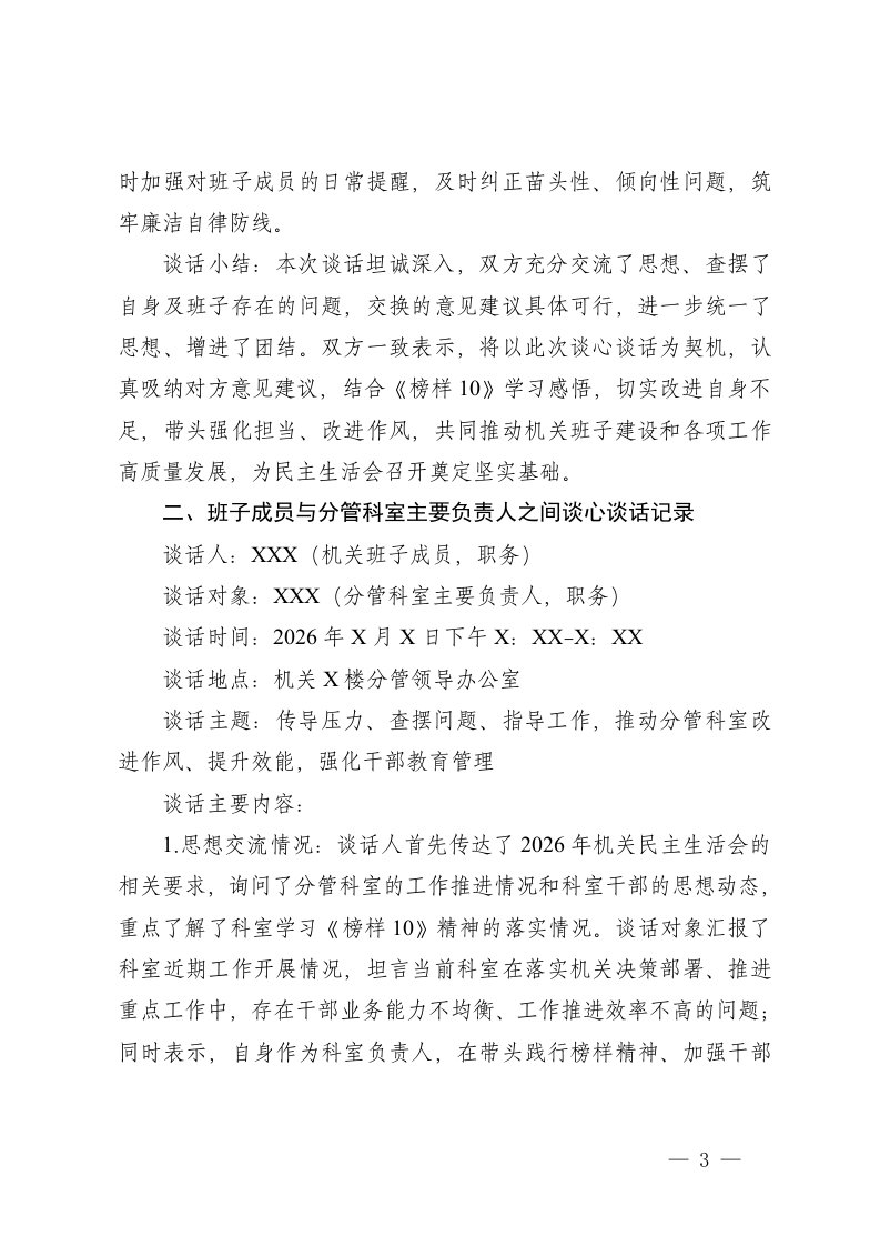 2026年机关民主生活会谈心谈话记录班子成员之间谈心谈话记录班子成员与分管科室主要负责人之间谈心谈话记录班子成员与本人组织关系所在党支部党员代表之间谈心谈话记录