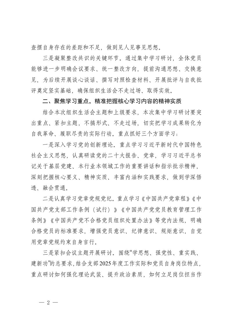 标题:2025年度在党支部组织生活会前集中学习研讨上的讲话提纲
