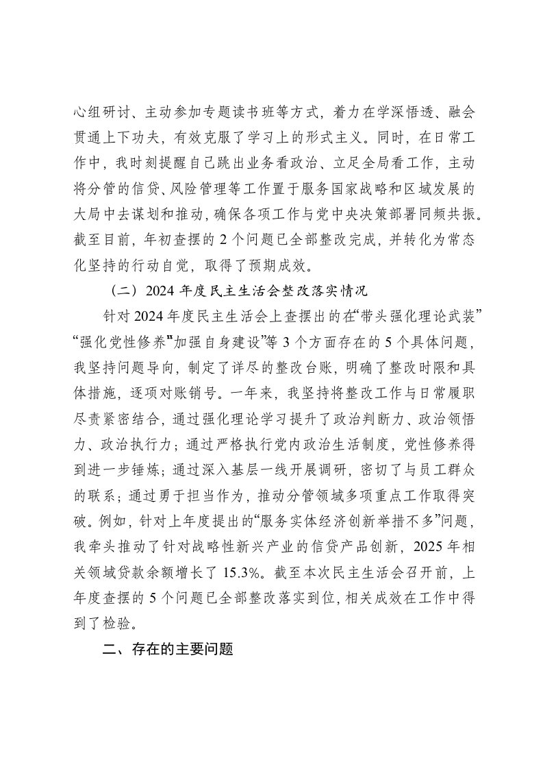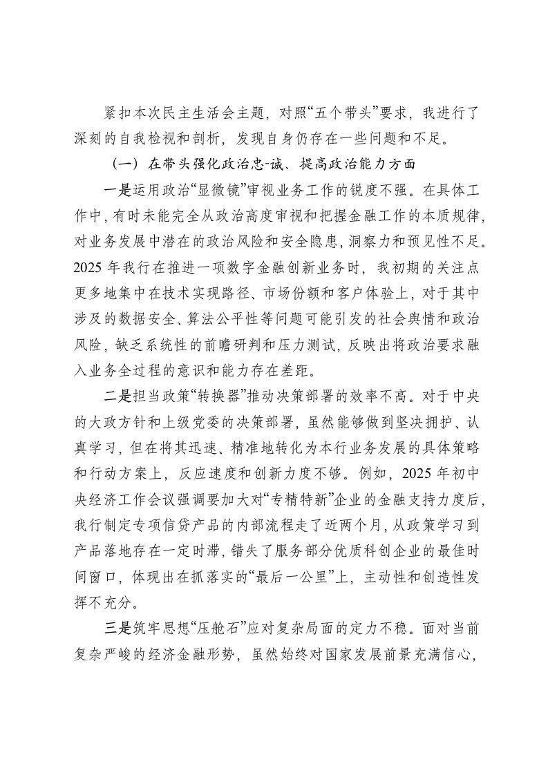 标题:银行班子成员2025年度民主生活会个人对照检查材料
