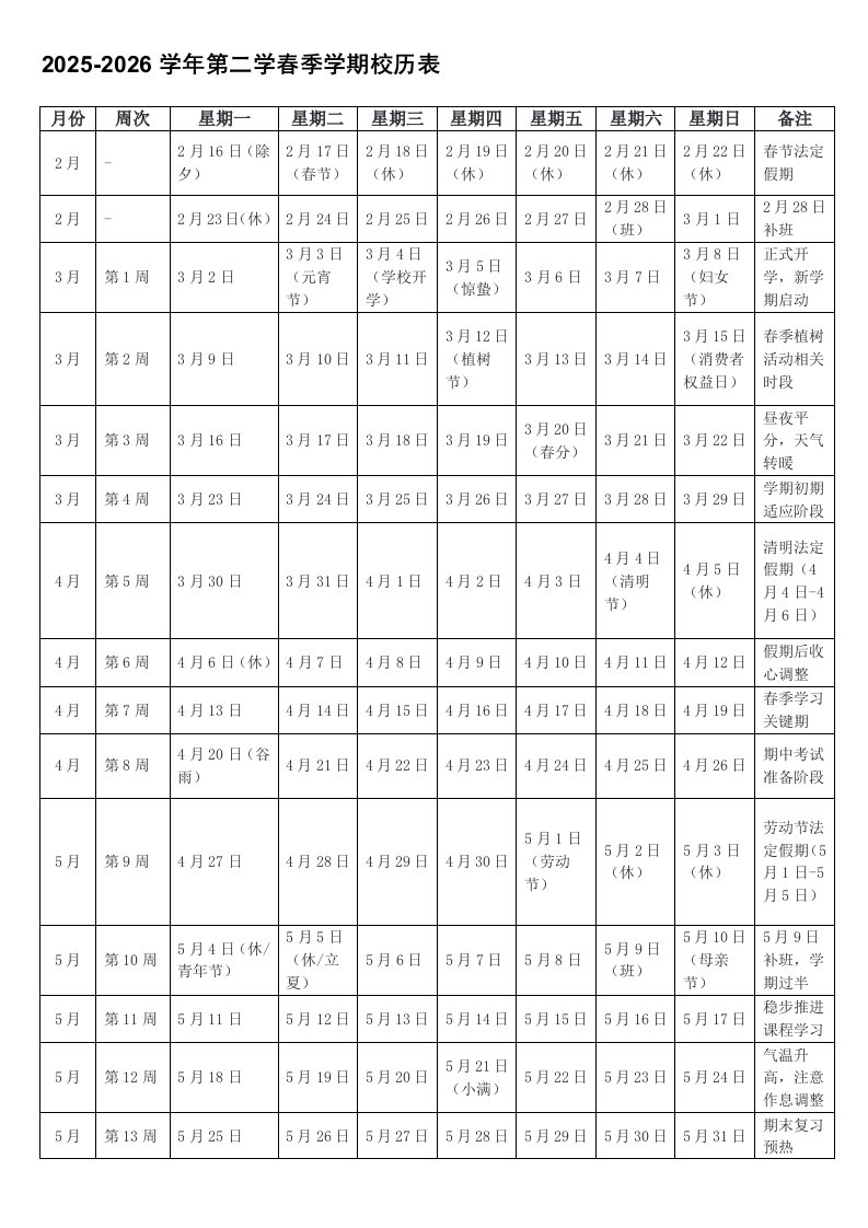 学校2025-2026学年第二学期教学校历表2025-2026学年第二学春季学期校历表学校2025-2026学年第二学期教学校历表2025-2026学年第二学春季学期校历表