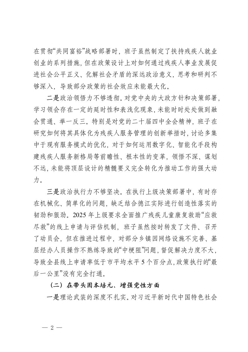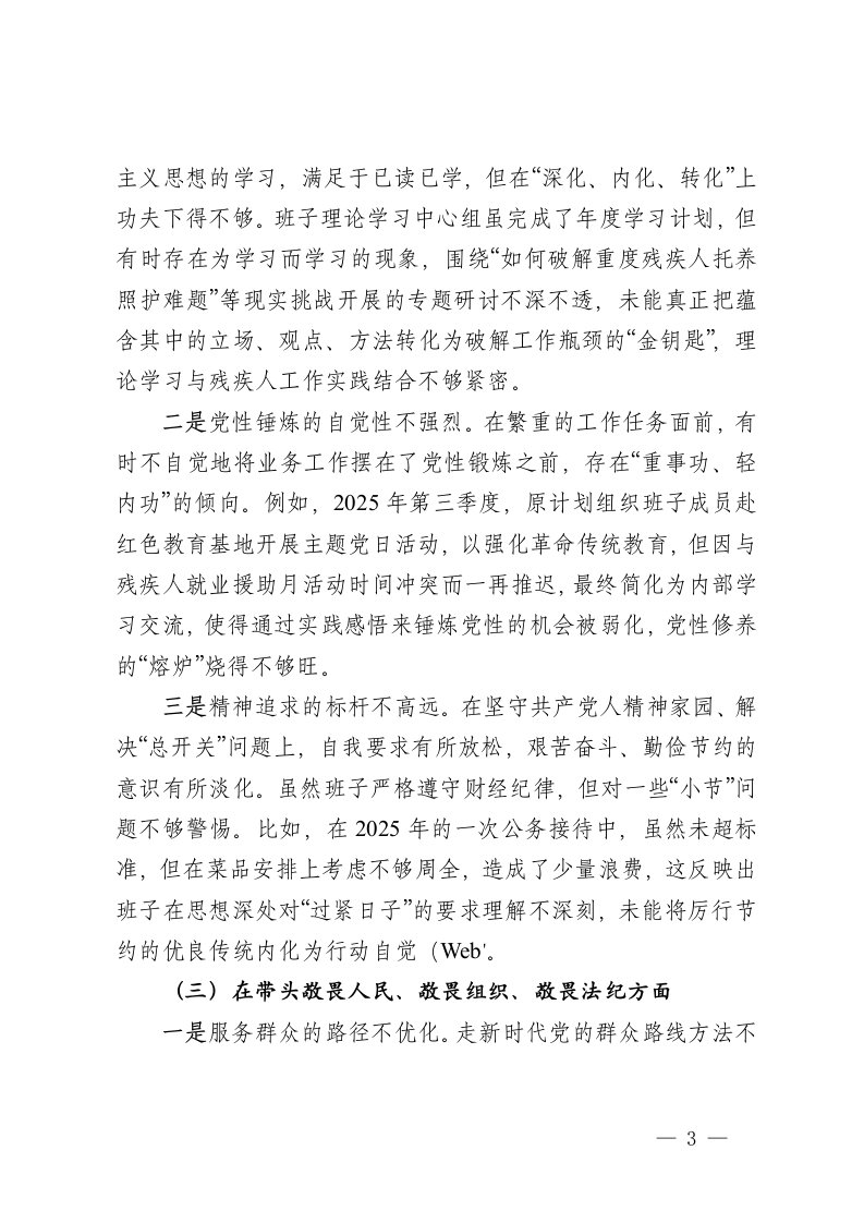 标题:县残联2025年度民主生活会班子对照检查材料