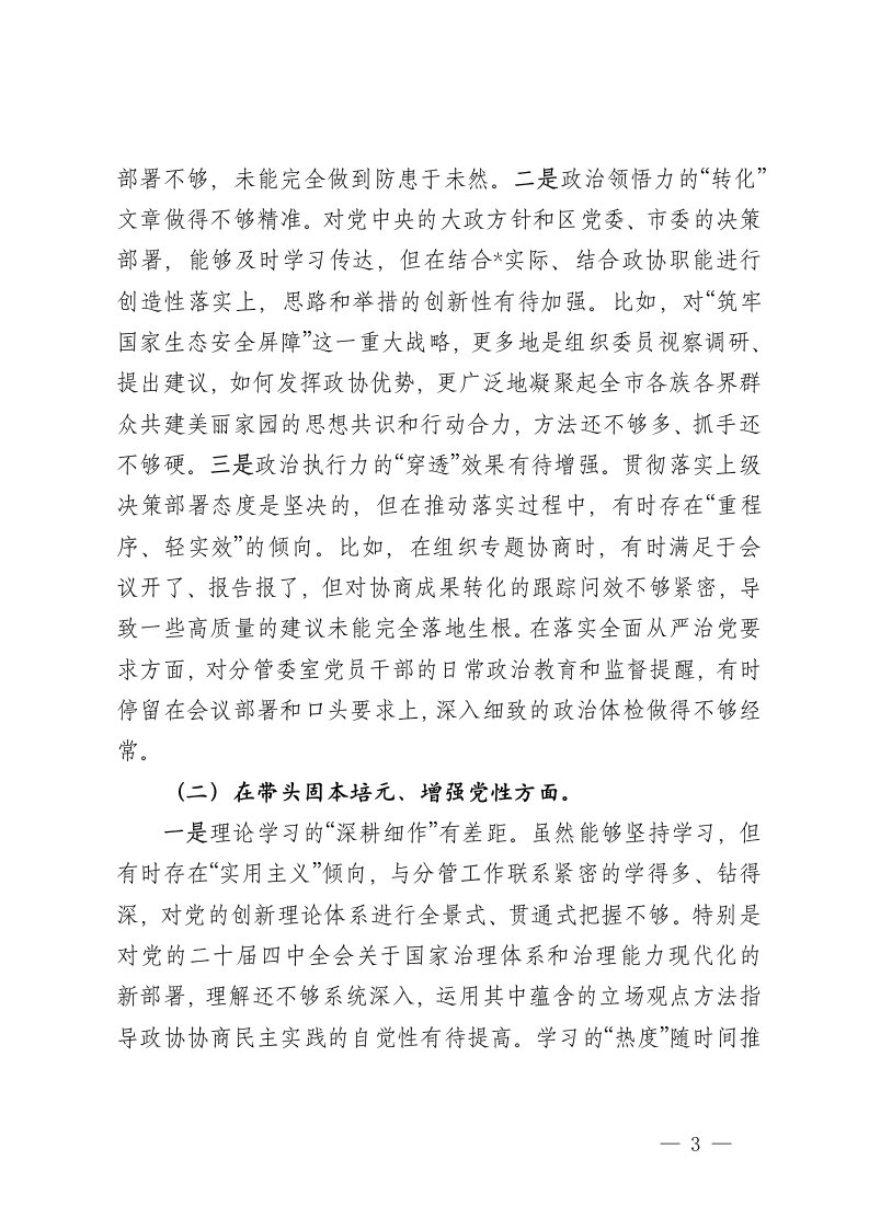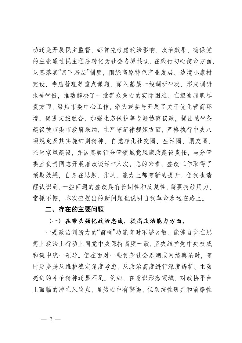 标题:市政协副主席2025年度民主生活会对照检查材料五个带头
