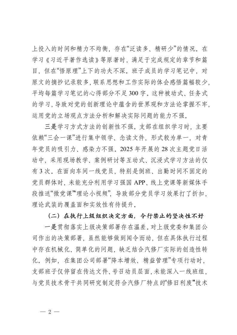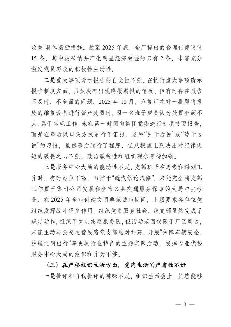 标题:汽修厂党支部2025年度组织生活会班子对照检查材料