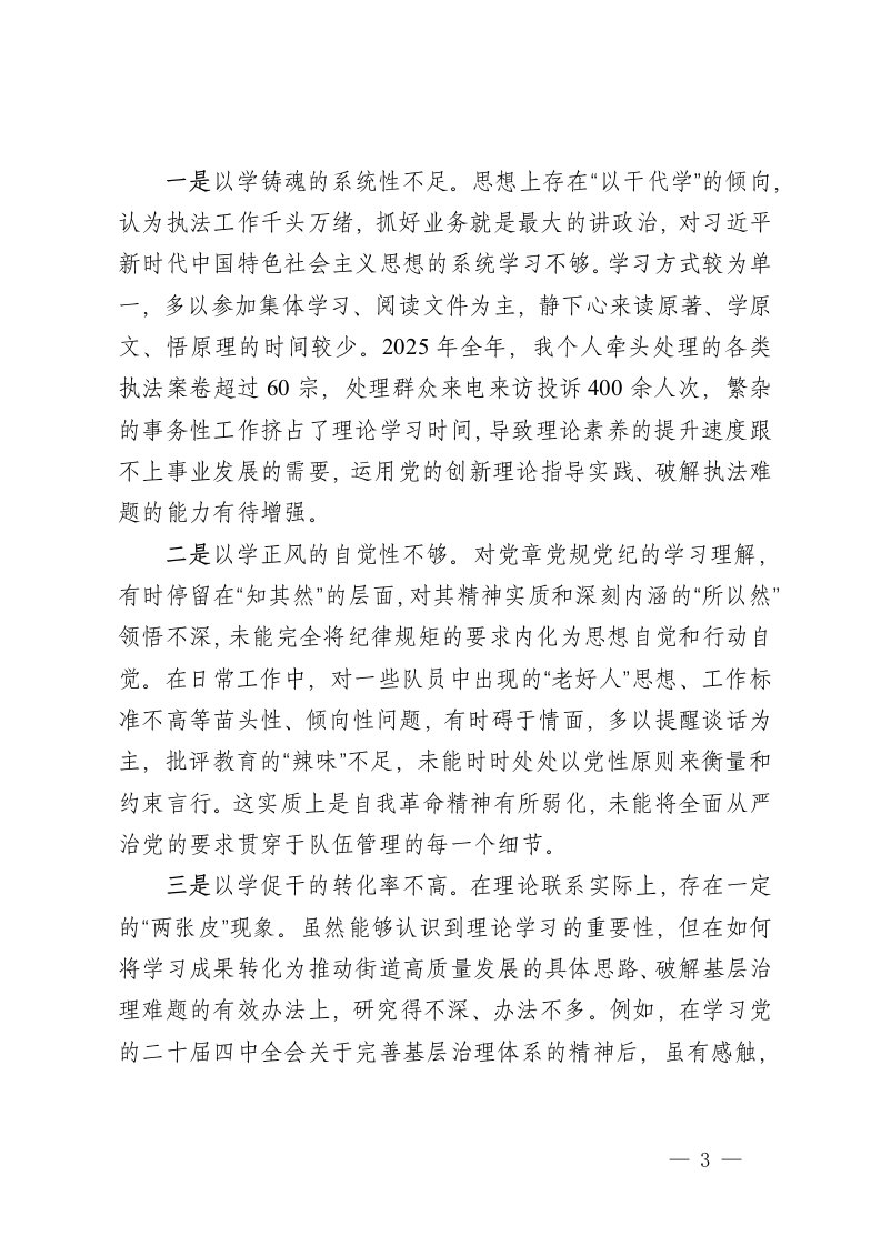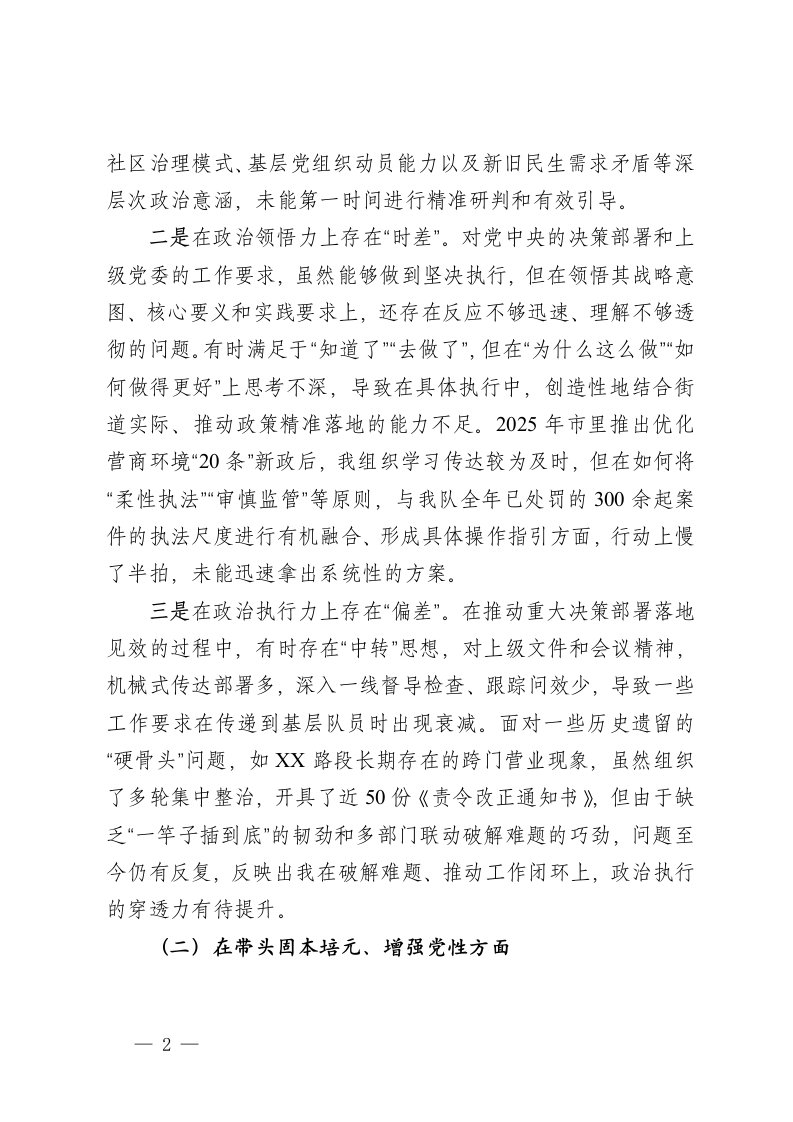 标题:街道综合行政执法队队长2025年度民主生活会个人对照检查材料五个带头