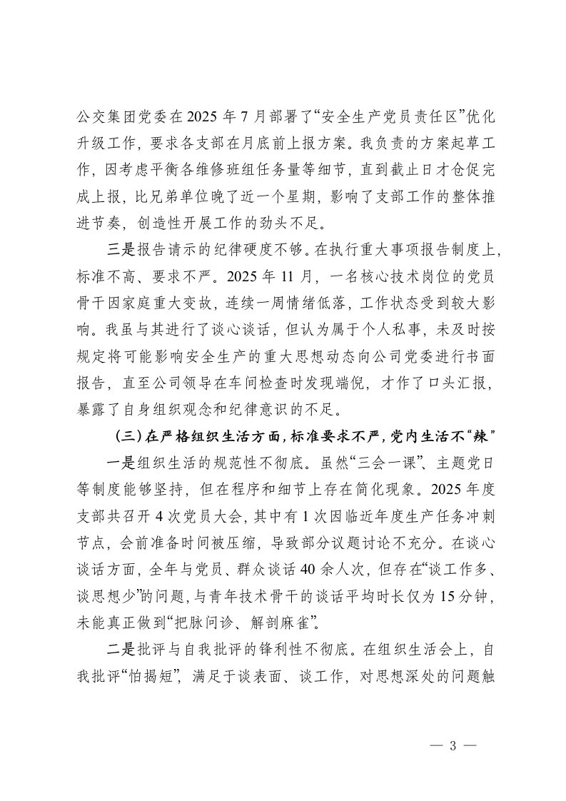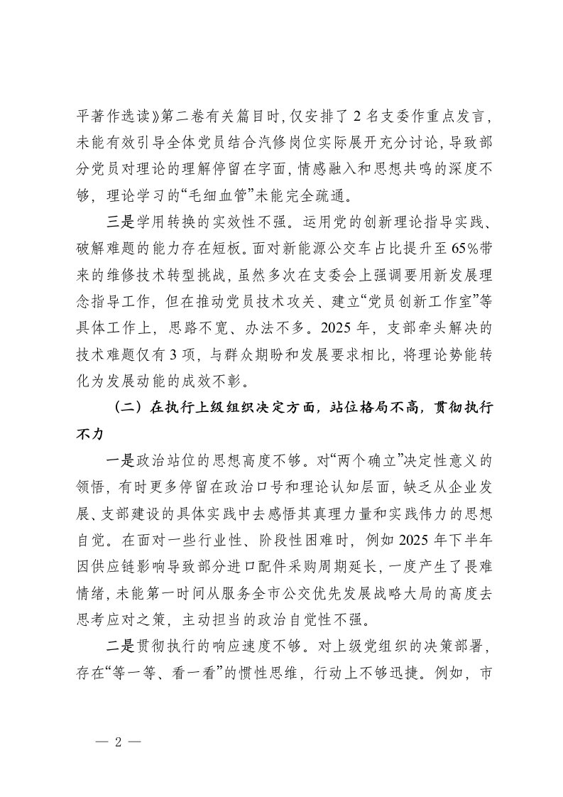 标题:公交汽修厂党支部组织委员2025年度组织生活会个人对照检查材料