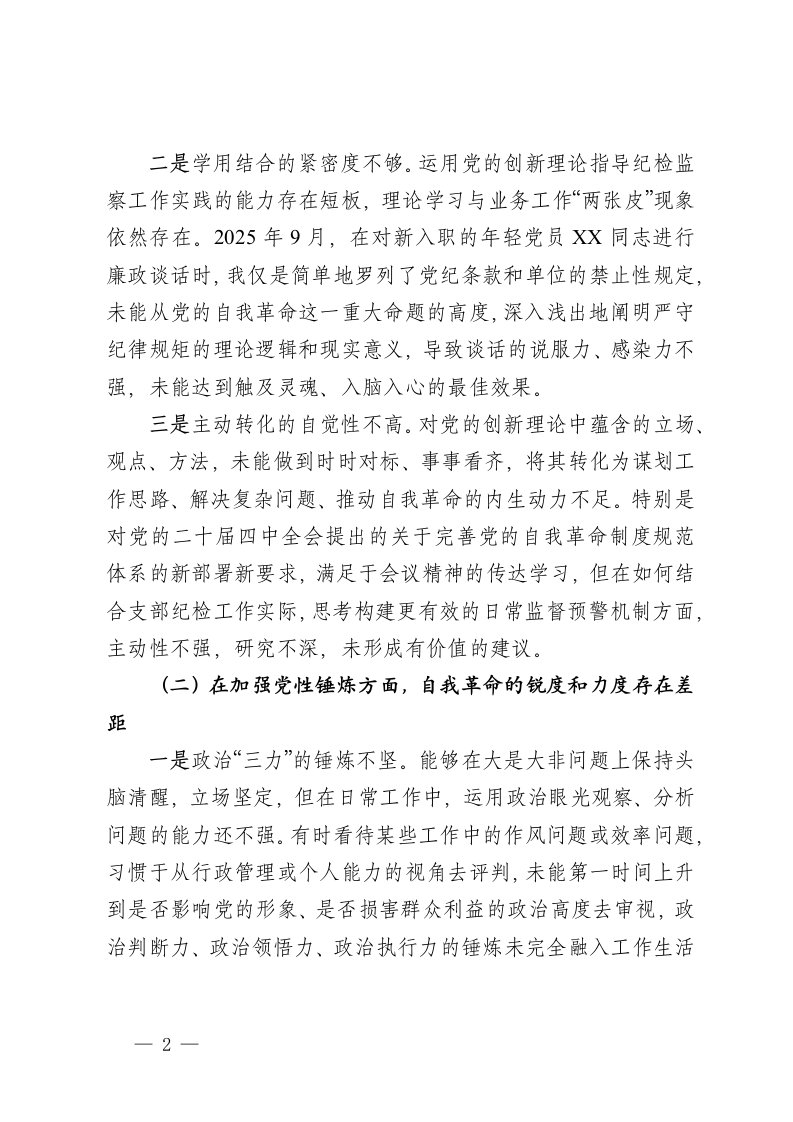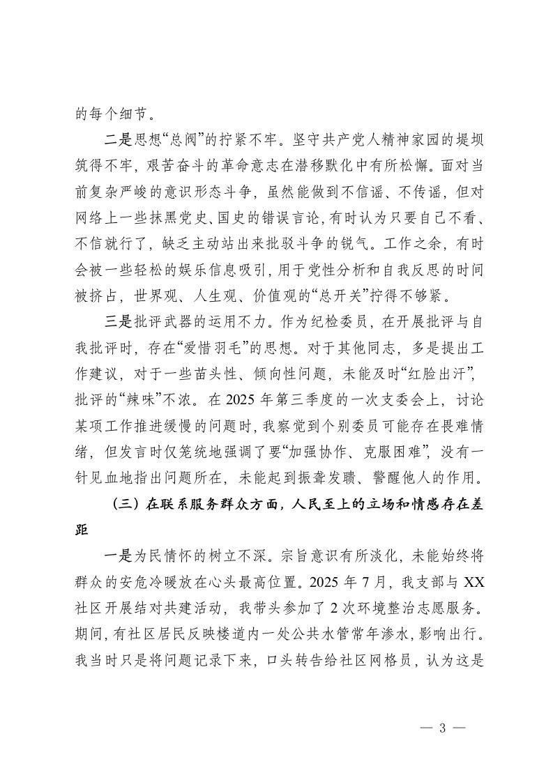 标题:党支部纪检委员2025年度组织生活会个人对照检查材料