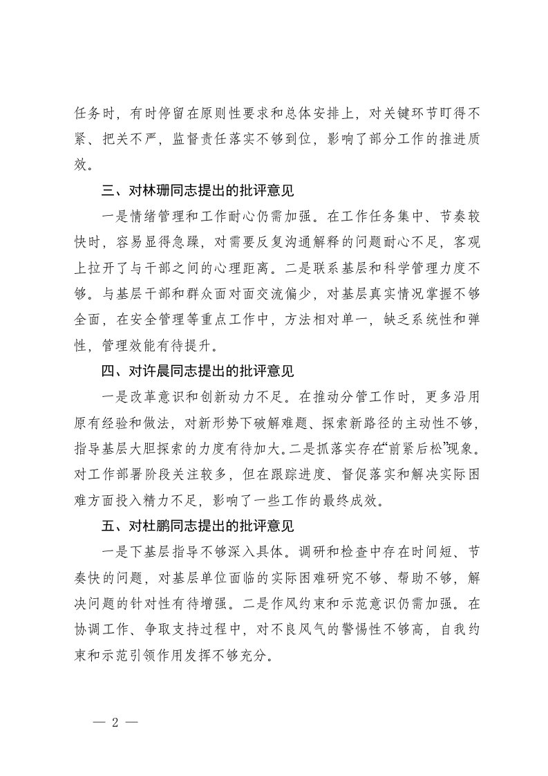 2025年度领导班子成员互相批评意见班子成员对主要负责同志的批评意见主要负责同志对班子成员的批评意见班子成员对主要负责同志的批评意见汇编