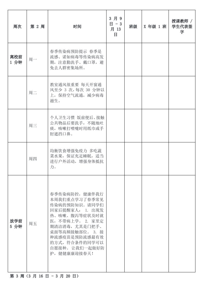 标题:2026年春季学期1530各周安全教育记录表全17周