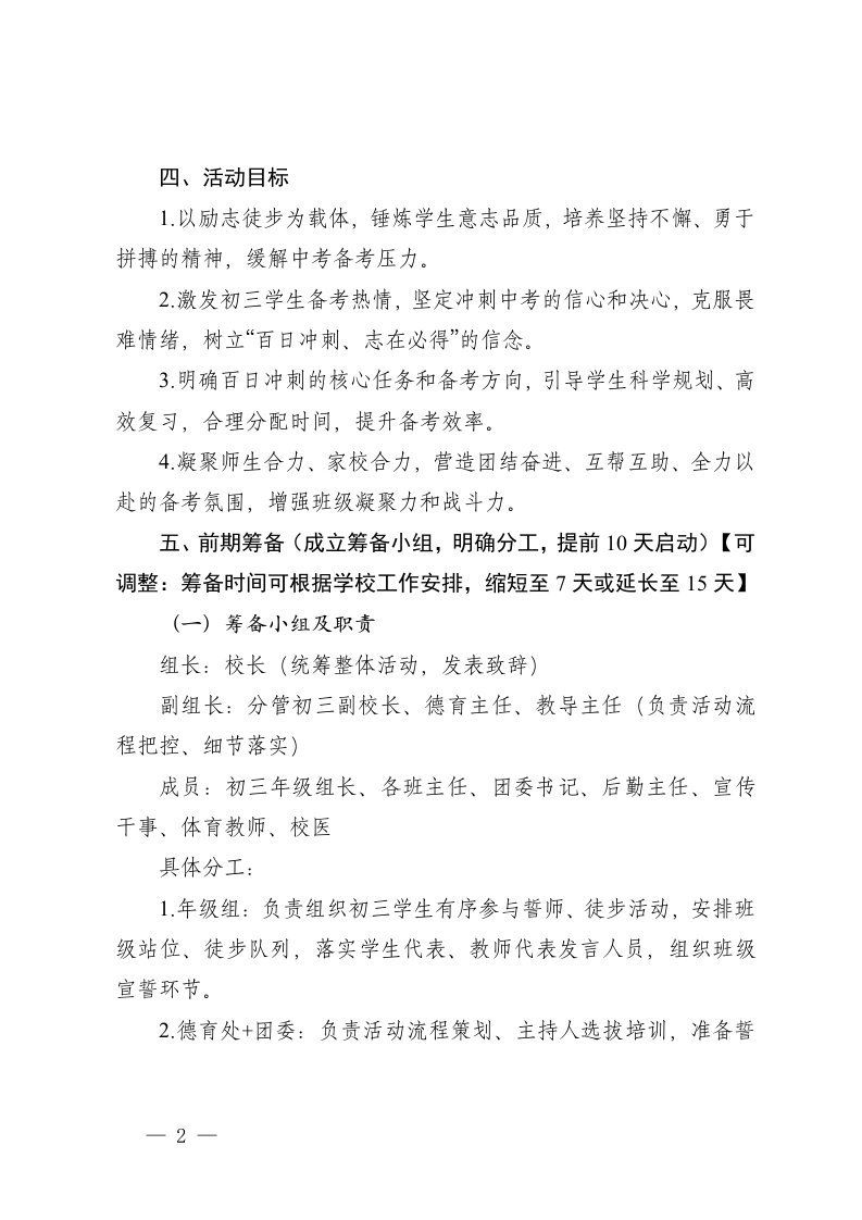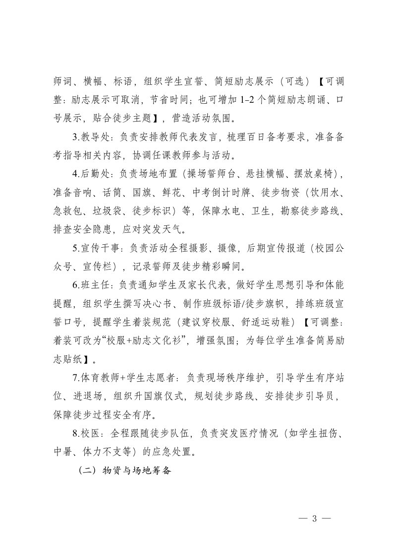 标题:2026年初三年级中考冲刺誓师励志徒步活动方案附校长致辞教师代表发言学生代表发言