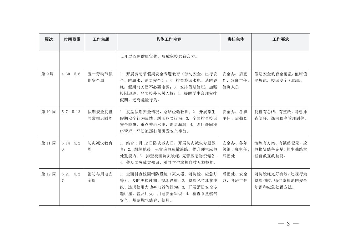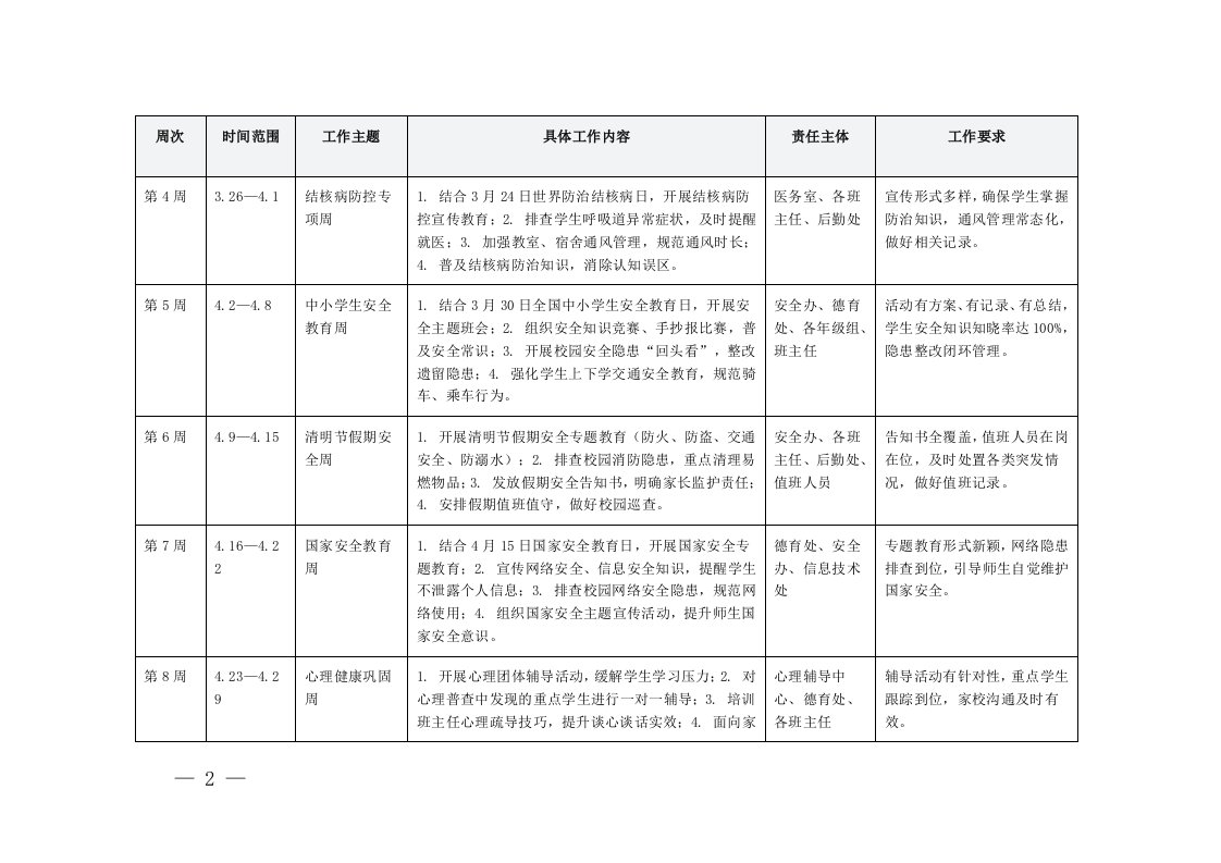 工作,学校2026年春季学期学校安全工作安排表18周3月5日-7月5日工作,学校2026年春季学期学校安全工作安排表18周3月5日-7月5日