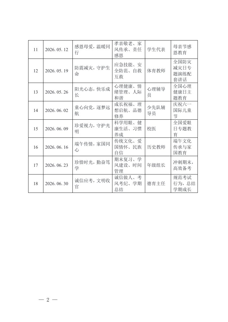 2026年春季学期18周主题升旗仪式安排表2026年春季学期18周主题升旗仪式安排表