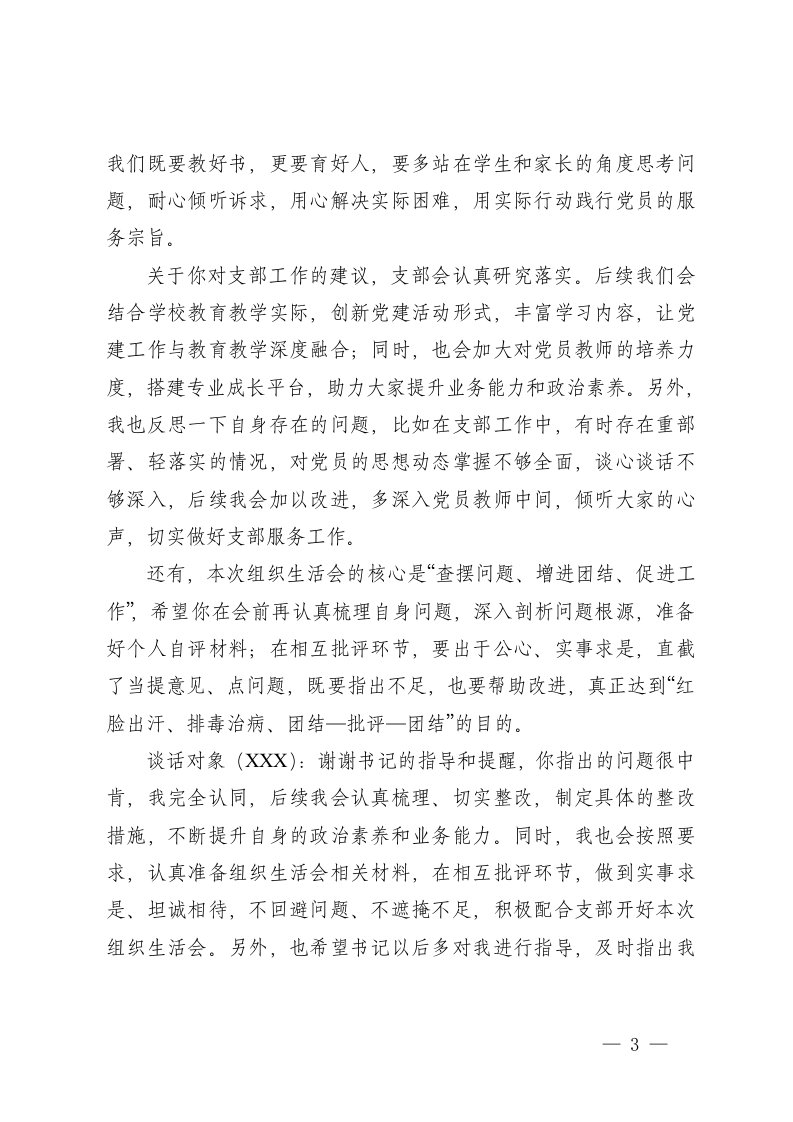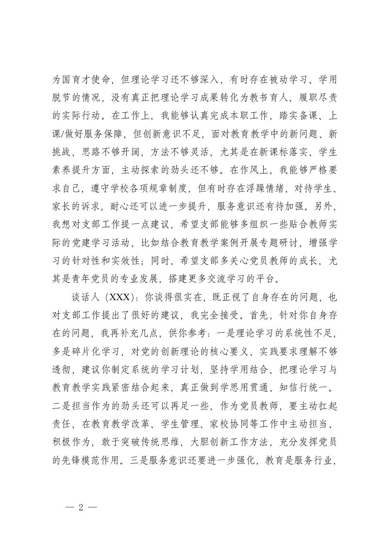 标题:XXX学校党支部2025年度组织生活会会前谈心谈话记录2份
