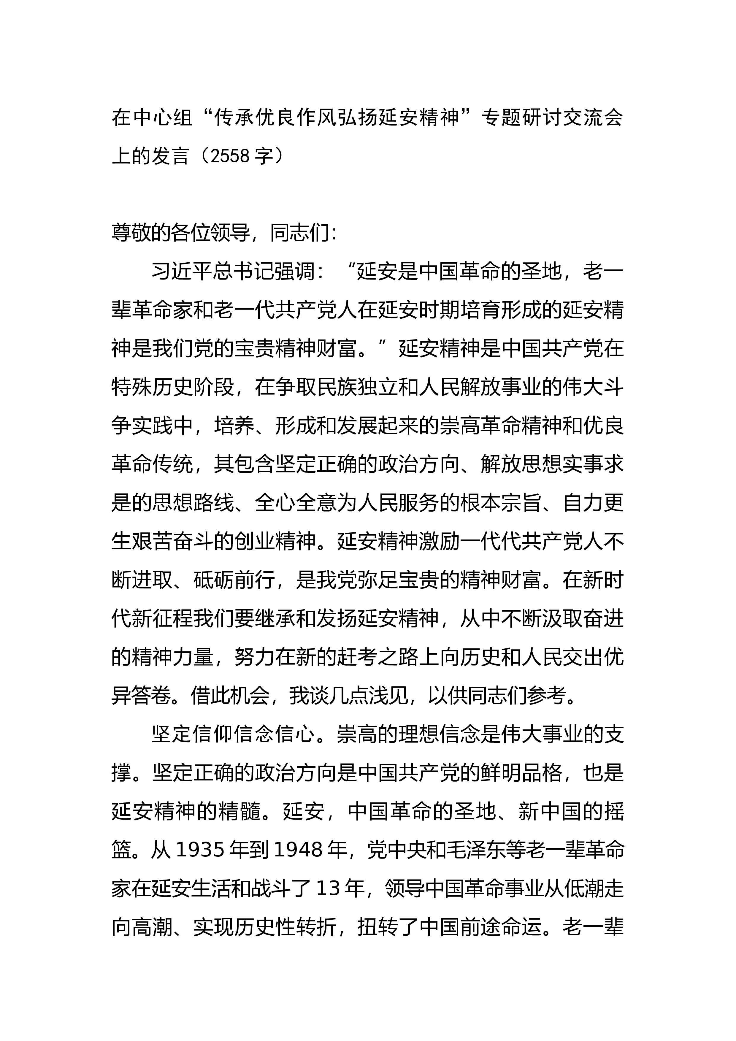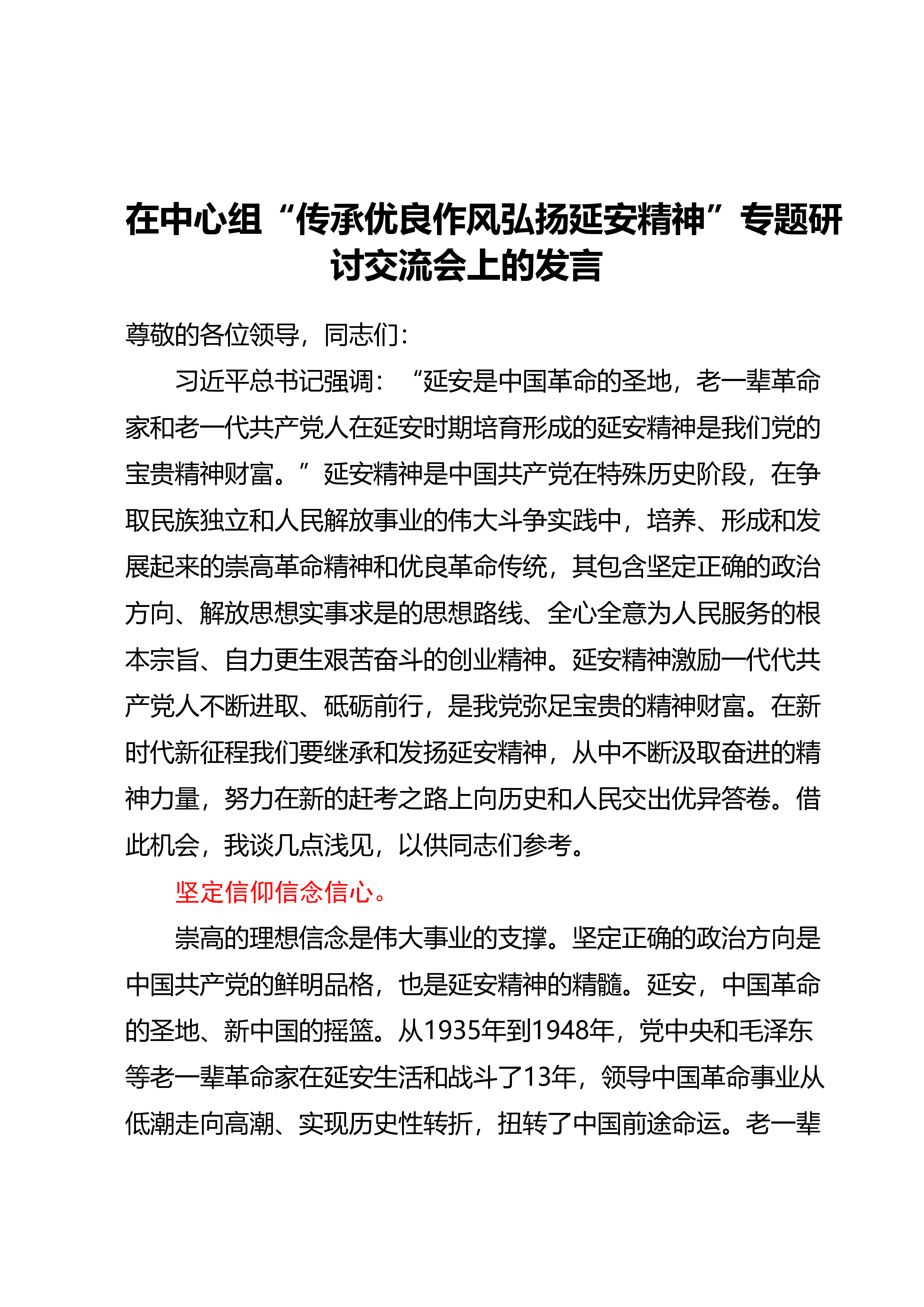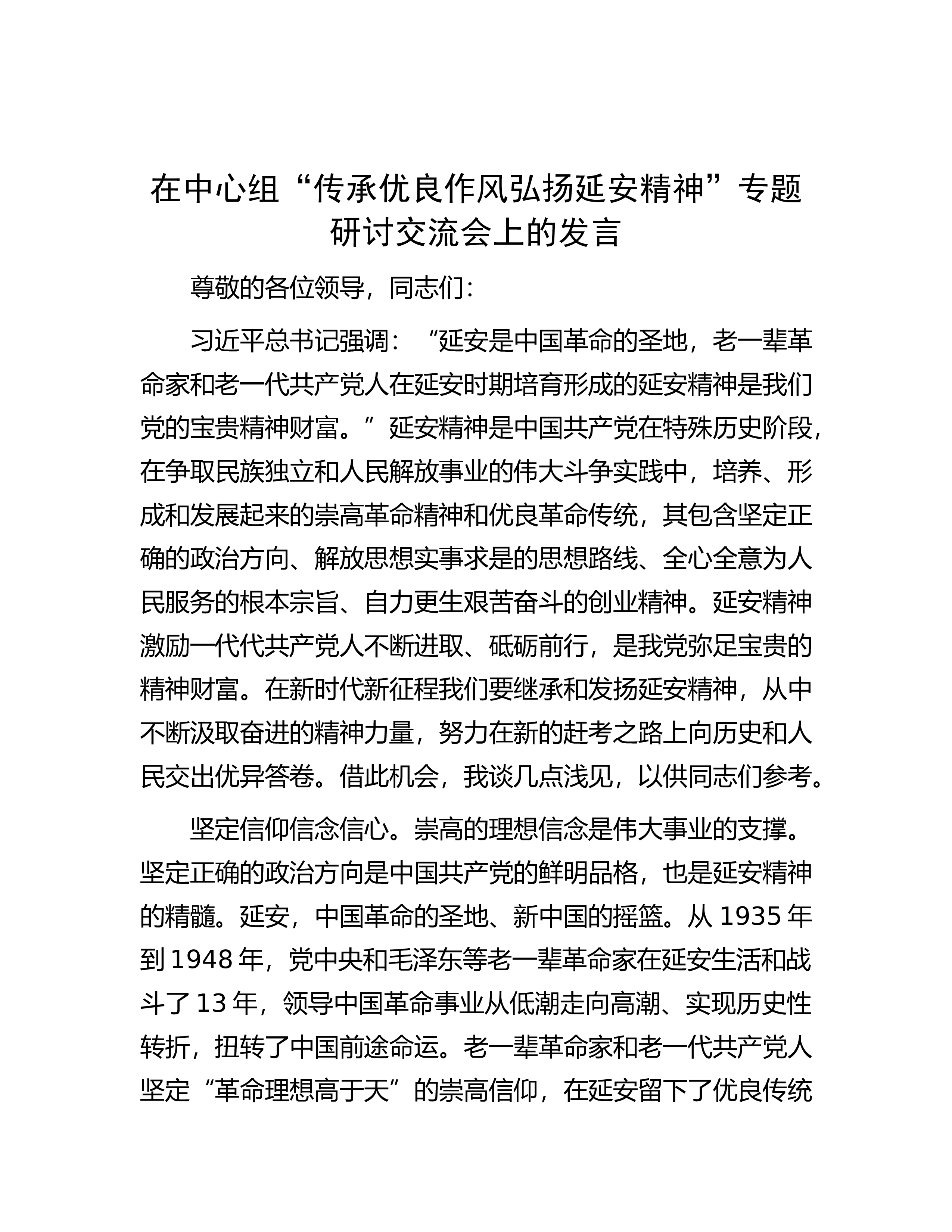 在中心组“传承优良作风弘扬延安精神”专题研讨交流会上的发言尊敬的各位领导,同志们:习近平总书记强调:“延安是中国革命的圣地,老一辈革命家和老一代共产党人在延安时期培育形成的延安精神是我们党的宝贵精神财富。”延安精神是中国共产党在特殊历史阶段,在争取民族独立和人民解放事业的伟大斗争实践中,培养、形成和发展起来的崇高革命精神和优良革命传统,其包含坚定正确的政治方向、解放思想实事求是的思想路线、全心全意为人民服务的根本宗旨、自力更生艰苦奋斗的创业精神。延安精神激励一代代共产党人不断进取、砥砺前行,是我党弥足宝贵的精神财富。在新时代新征程我们要继承和发扬延安精神,从中不断汲取奋进的精神力量,努力在新的...