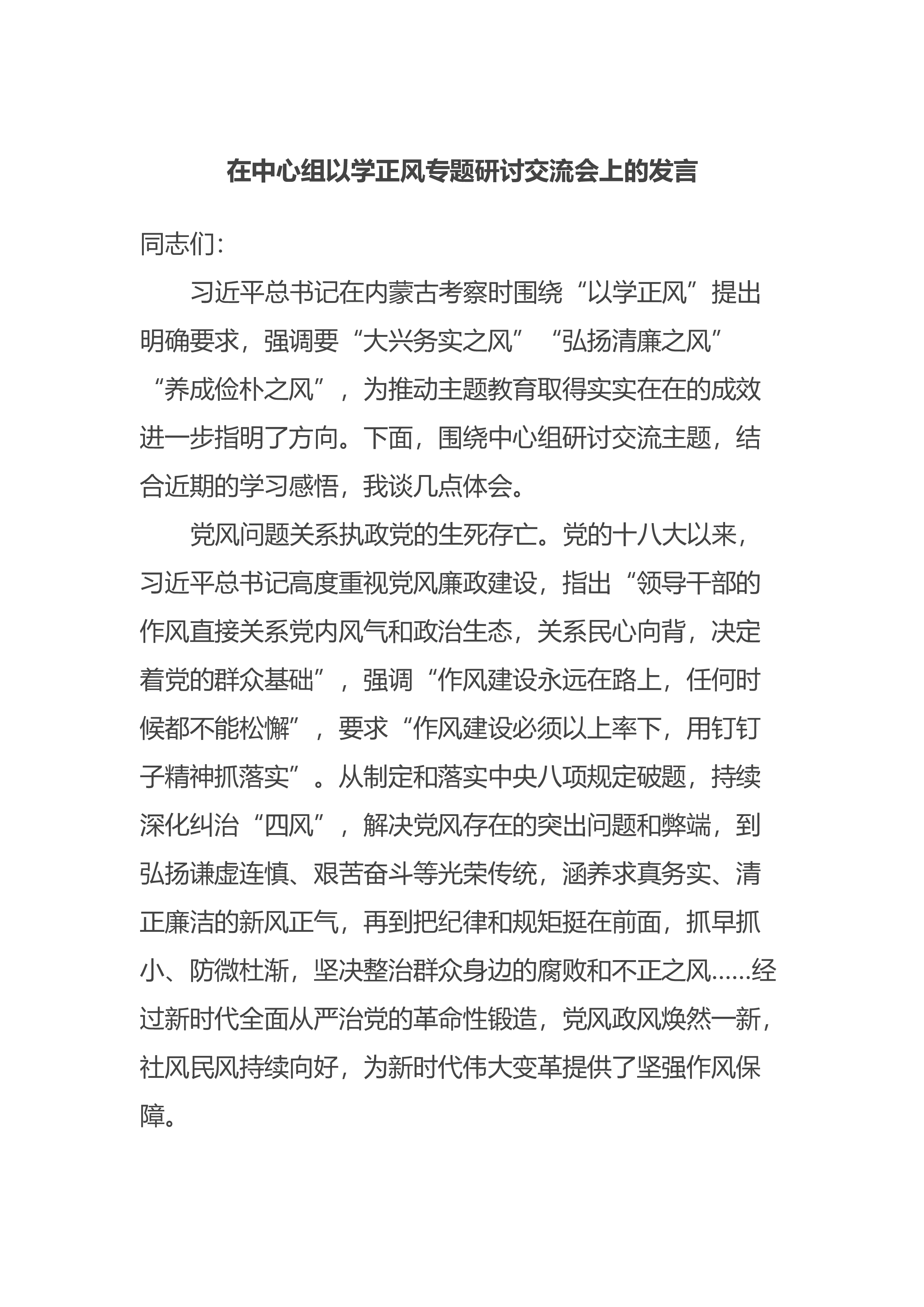 在中心组“传承优良作风 弘扬延安精神”专题研讨交流会上的发言