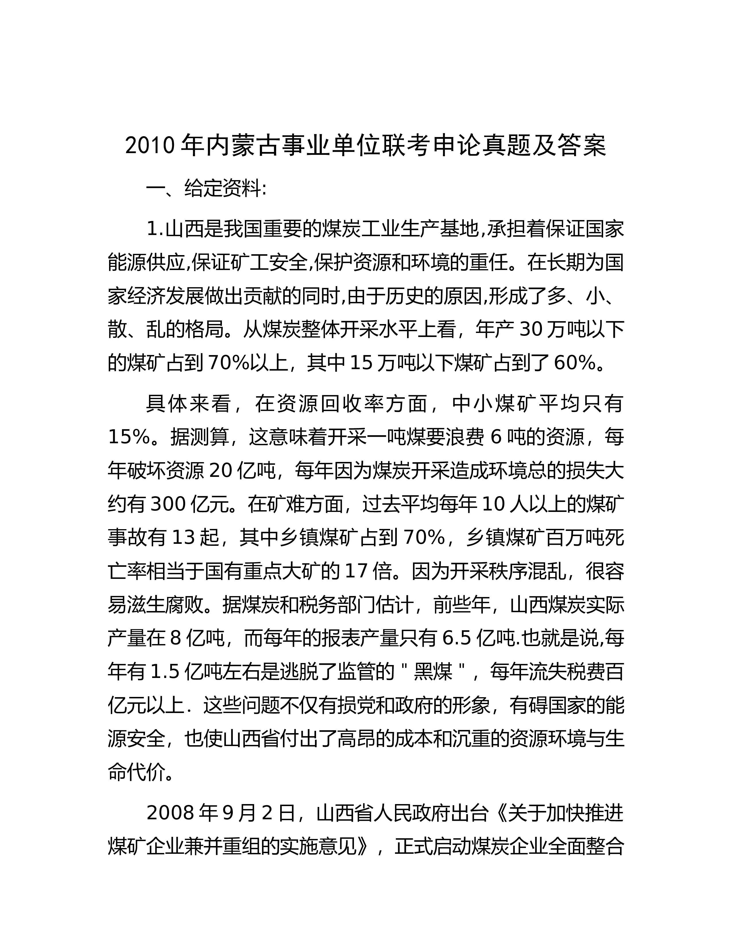 2010年内蒙古事业单位联考申论真题及答案一、给定资料:1.山西是我国重要的煤炭工业生产基地,承担着保证国家能源供应,保证矿工安全,保护资源和环境的重任。在长期为国家经济发展做出贡献的同时,由于历史的原因,形成了多、小、散、乱的格局。从煤炭整体开采水平上看,年产30万吨以下的煤矿占到70%以上,其中15万吨以下煤矿占到了60%。具体来看,在资源回收率方面,中小煤矿平均只有15%。据测算,这意味着开采一吨煤要浪费6吨的资源,每年破坏资源20亿吨,每年因为煤炭开采造成环境总的损失大约有300亿元。在矿难方面,过去平均每年10人以上的煤矿事故有13起,其中乡镇煤矿占到70%,乡镇煤矿百万吨死亡率相当...