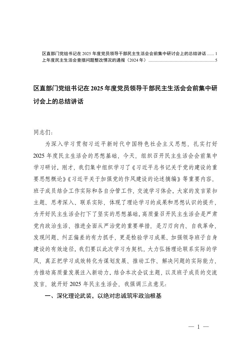 党组理论学习中心组学习会议暨2025年民主生活会会前研讨发言时的讲话党员干部在2025年度民主生活会上的总结讲话