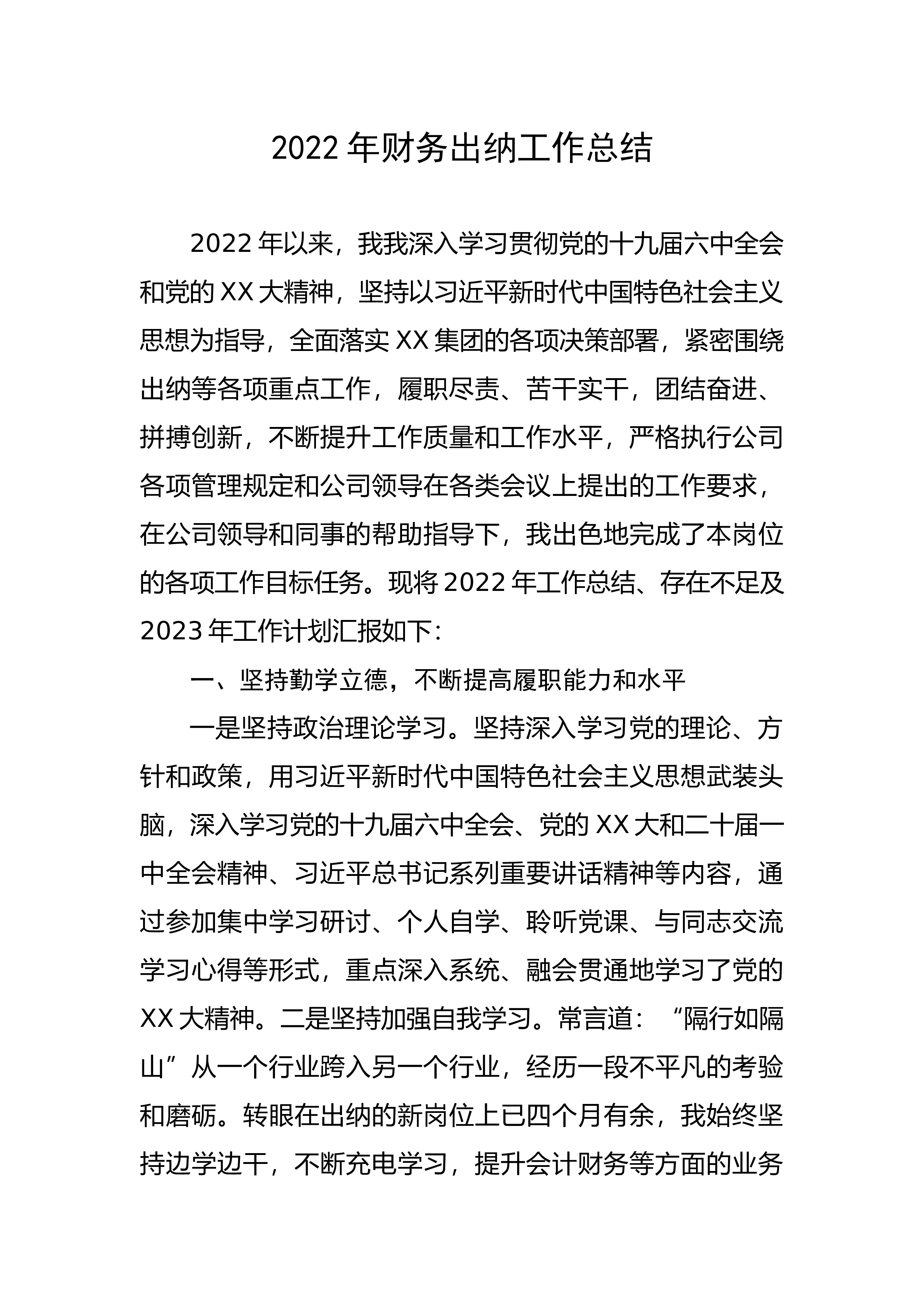 2022年以来,我我深入学习贯彻党的十九届六中全会和党的XX大精神,坚持以习近平新时代中国特色社会主义思想为指导,全面落实XX集团的各项决策部署,紧密围绕出纳等各项重点工作,履职尽责、苦干实干,团结奋进、拼搏创新,不断提升工作质量和工作水平,严格执行公司各项管理规定和公司领导在各类会议上提出的工作要求,在公司领导和同事的帮助指导下,我出色地完成了本岗位的各项工作目标任务。现将2022年