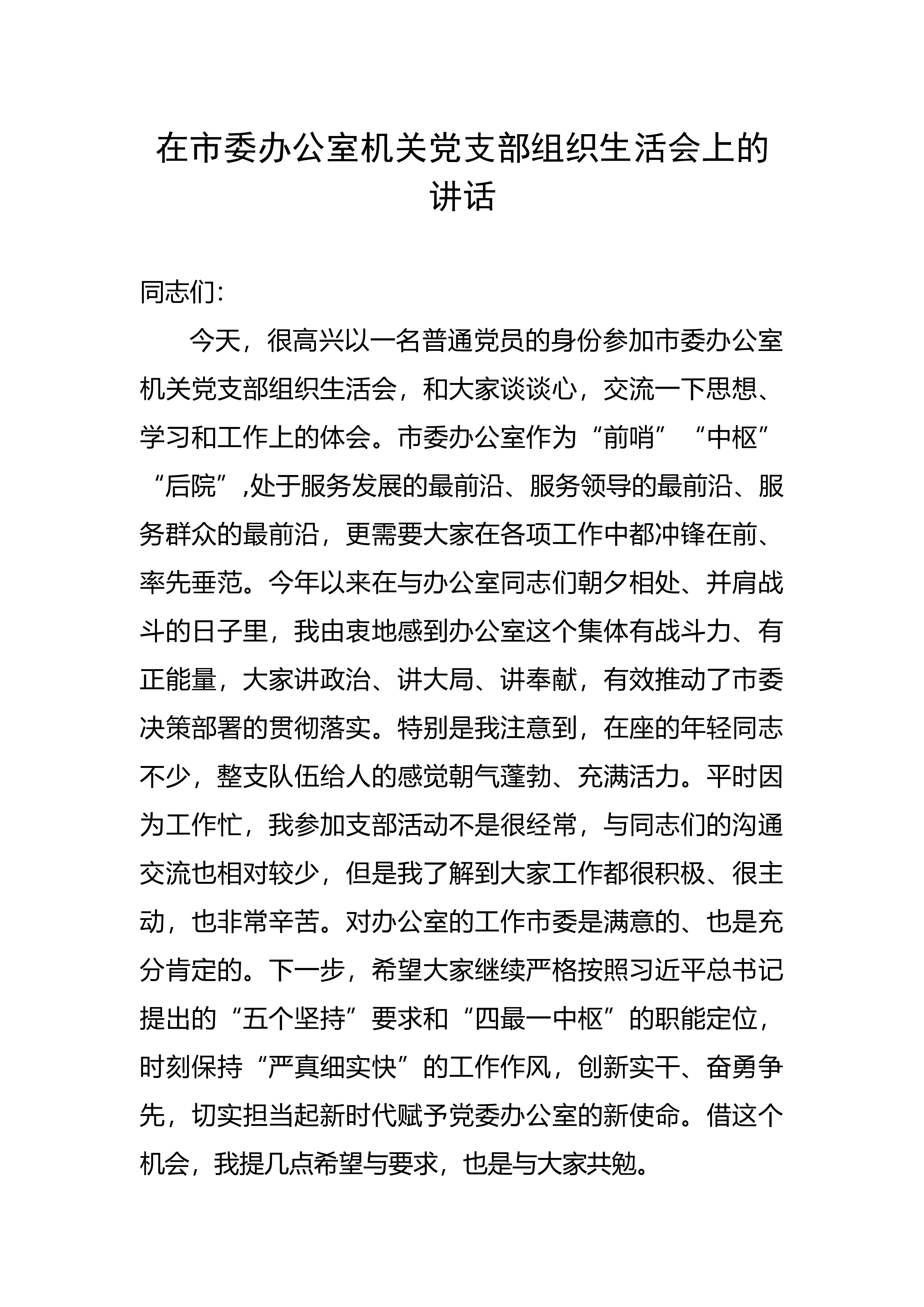 在市委办公室机关党支部组织生活会上的讲话同志们:今天,很高兴以一名普通党员的身份参加市委办公室机关党支部组织生活会,和大家谈谈心,交流一下思想、学习和工作上的体会。市委办公室作为“前哨”“中枢”“后院”,处于服务发展的最前沿、服务领导的最前沿、服务群众的最前沿,更需要大家在各项工作中都冲锋在前、率先垂范。今年以来在与办公室同志们朝夕相处、并肩战斗的日子里,我由衷地感到办公室这个集体有战斗力、有正能量,大家讲政治、讲大局、讲奉献,有效推动了市委决策部署的贯彻落实。特别是我注意到,在座的年轻同志不少,整支队伍给人的感觉朝气蓬勃、充满活力。平时因为工作忙,我参加支部活动不是很经常,与同志们的沟通交流...