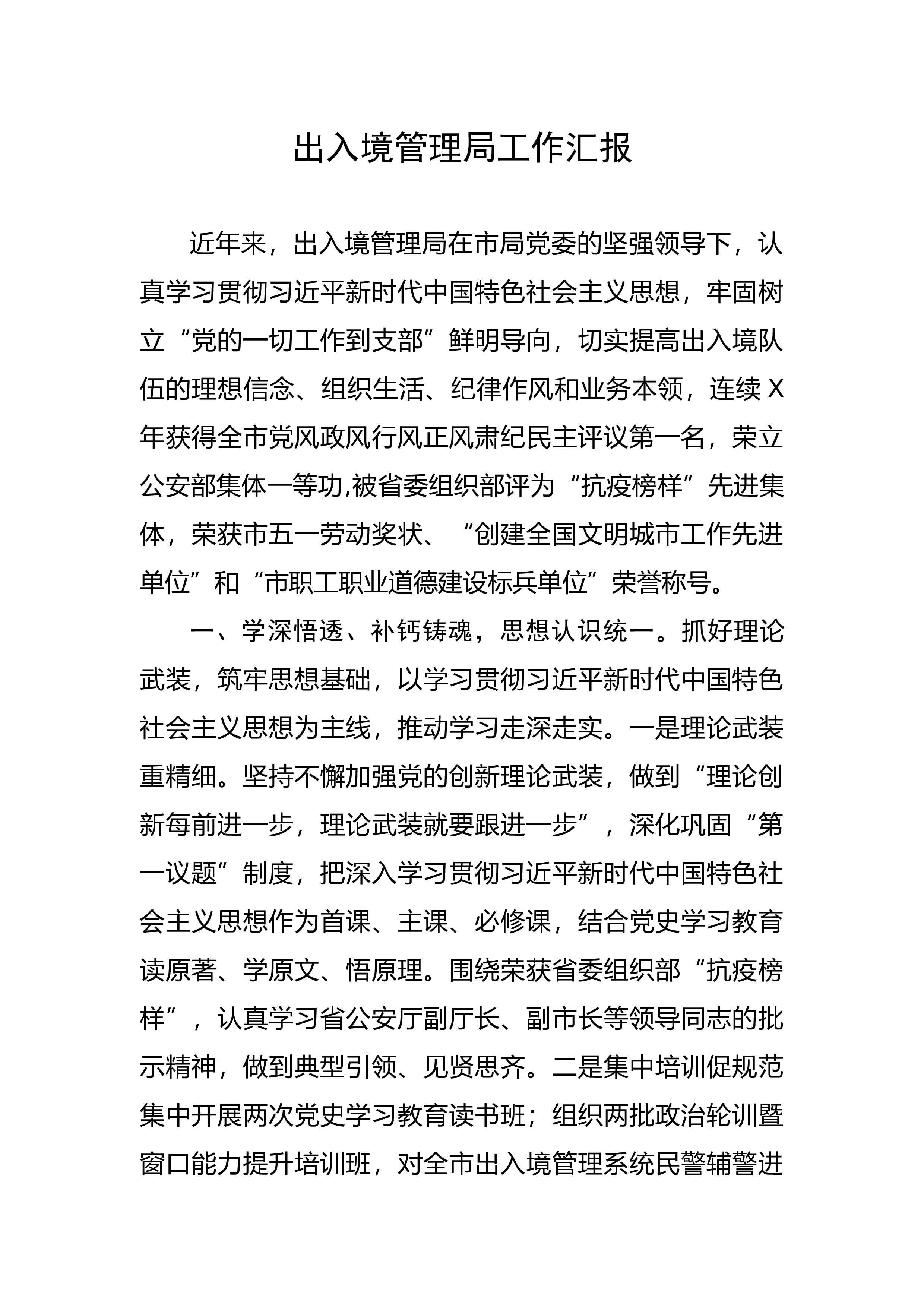 出入境管理局工作汇报近年来,出入境管理局在市局党委的坚强领导下,认真学习贯彻习近平新时代中国特色社会主义思想,牢固树立“党的一切工作到支部”鲜明导向,切实提高出入境队伍的理想信念、组织生活、纪律作风和业务本领,连续X年获得全市党风政风行风正风肃纪民主评议第一名,荣立公安部集体一等功,被省委组织部评为“抗疫
