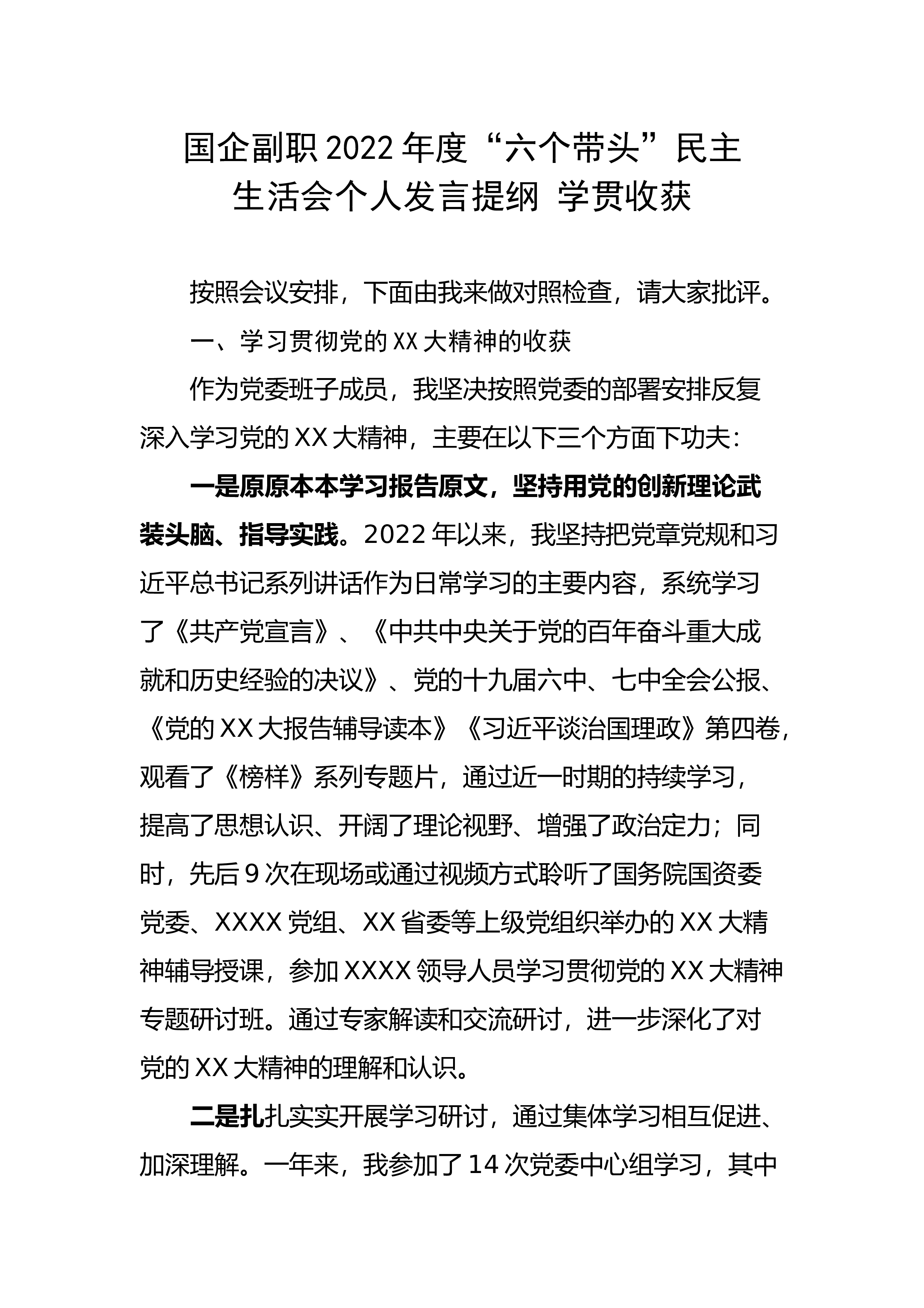 国企副职2022年度“六个带头”民主生活会个人发言提纲学贯收获按照会议安排,下面由我来做对照检查,请大家批评。一、学习贯彻党的XX大精神的收获作为党委班子成员,我坚决按照党委的部署安排反复深入学习党的XX大精神,主要在以下三个方面下功夫:一是原原本本学习报告原文,坚持用党的创新理论武装头脑、指导实践。2022年以来,我坚持把党章党规和习近平总书记系列讲话作为日常学习的主要内容,系统学习了《共产党宣言》、《中共中央关于党的百年奋斗重大成就和历史经验的决议》、党的十九届六中、七中全会公报、《党的XX大报告辅导读本》《习近平谈治国理政》第四卷,观看了《