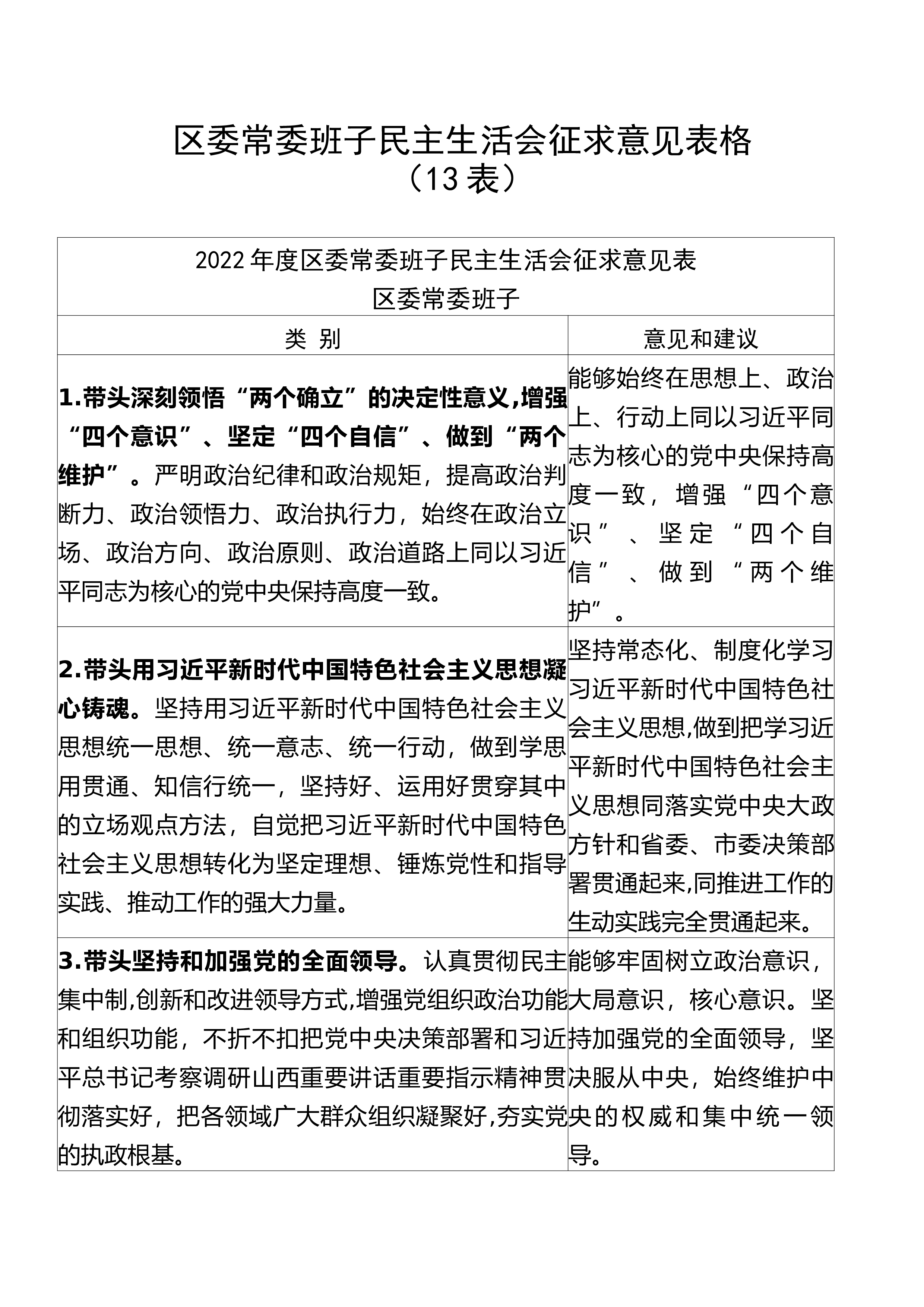 区委常委班子民主生活会征求意见表格(13表)2022年度区委常委班子民主生活会征求意见表区委常委班子类别意见和建议1.带头深刻领悟“两个确立”的决定性意义,增强“四个意识”、坚定“四个自信”、做到“两个维护”。严明政治纪律和政治规矩,提高政治判断力、政治领悟力、政治执行力,始终在政治立场、政治方向、政治原则、政治道路上同以习近平同志为核心的党中央保持高度一致。能够始终在思想上、政治上、行动上同以习近平同志为核心的党中央保持高度一致,增强“四个意识”、坚定“四个自信”、做到“两个维护”。2.带头用习近平新时代中国特色社会主义思想凝心铸魂。坚持用习近平新时代中国特色社会主义思想统一思想、统一意志、...