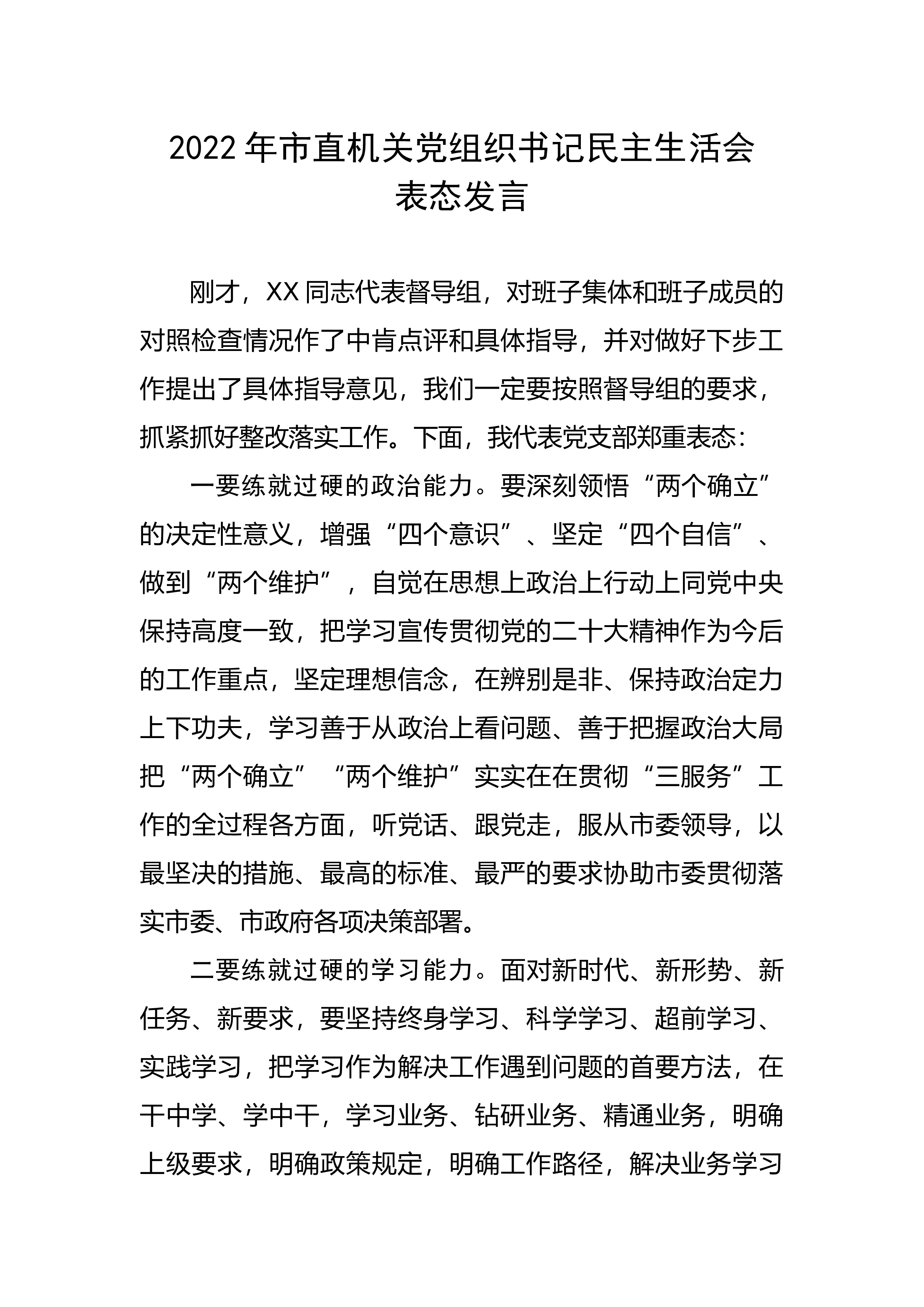 刚才,XX同志代表督导组,对班子集体和班子成员的对照检查情况作了中肯点评和具体指导,并对做好下步工作提出了具体指导意见,我们一定要按照督导组的要求,抓紧抓好整改落实工作。下面,我代表党支部郑重表态:一要练就过硬的政治能力。要深刻领悟“两个确立”的决定性意义,增强“四个意识”、坚定“四个自信”、做到“两个维护”,自觉在思想上政治上行动上同党中央保持高度一致,把学习宣传贯彻党的二十大精神作为今后的工作重点,坚定理想信念,在辨别是非、保持政治定力上下功夫,学习善于从政治上看问题、善于把握政治大局把“两个确立”“两个维护”实实在在贯彻“三服务”工作的全过程...