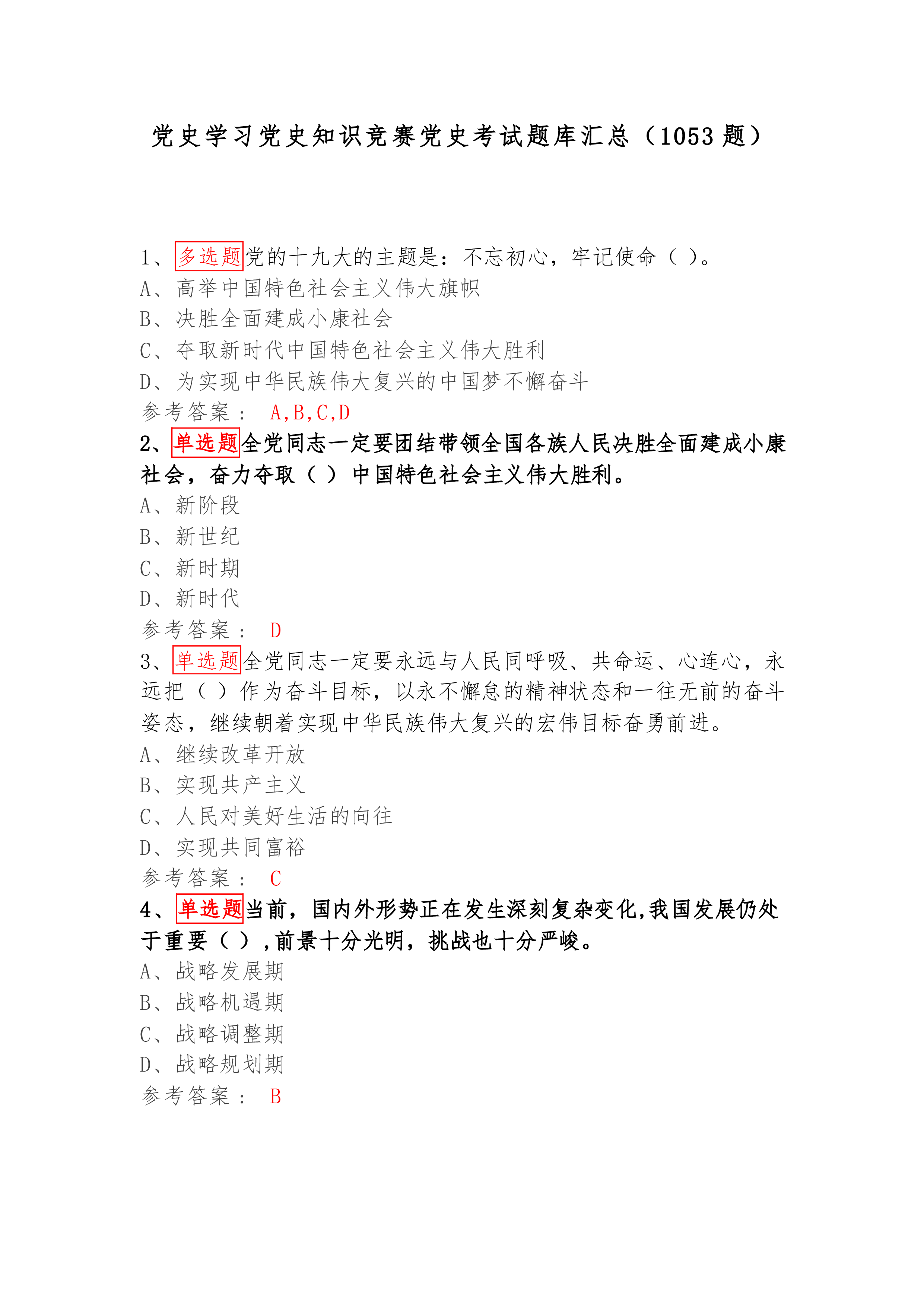 党史学习党史知识竞赛党史考试题库汇总(1053题)1、多选题党的十九大的主题是:不忘初心,牢记使命()。A、高举中国特色社会主义伟大旗帜B、决胜全面建成小康社会C、夺取新时代中国特色社会主义伟大胜利D、为实现中华民族伟大复兴的中国梦不懈奋斗参考答案:A,B,C,D2、单选题全党同志一定要团结带领全国各族人民决胜全面建成小康社会,奋力夺取()中国特色社会主义伟大胜利。A、新阶段B、新世纪C、新时期D、新时代参考答案:D3、单选题全党同志一定要永远与人民同呼吸、共命运、心连心,永远把()作为奋斗目标,以永不懈怠的精神状态和一往无前的奋斗姿态,继续朝着实现中华民族伟大复兴的宏伟目标奋勇前进。A、继续...