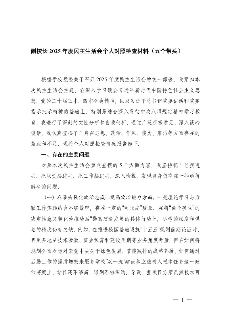 副校长2025年度民主生活会个人对照检查