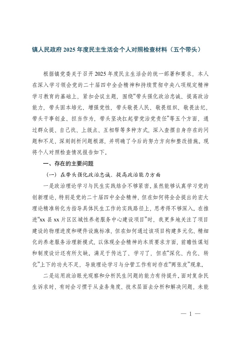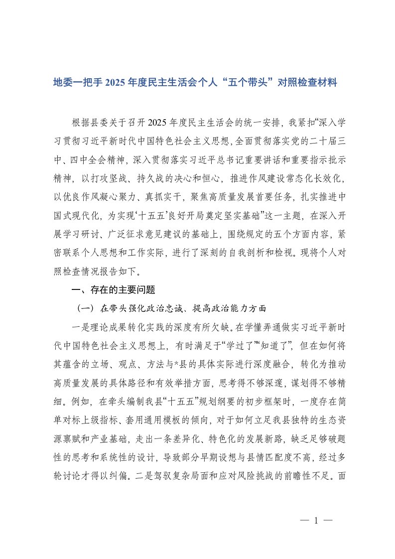地委一把手2025年度民主生活会个人五个带头对照检查