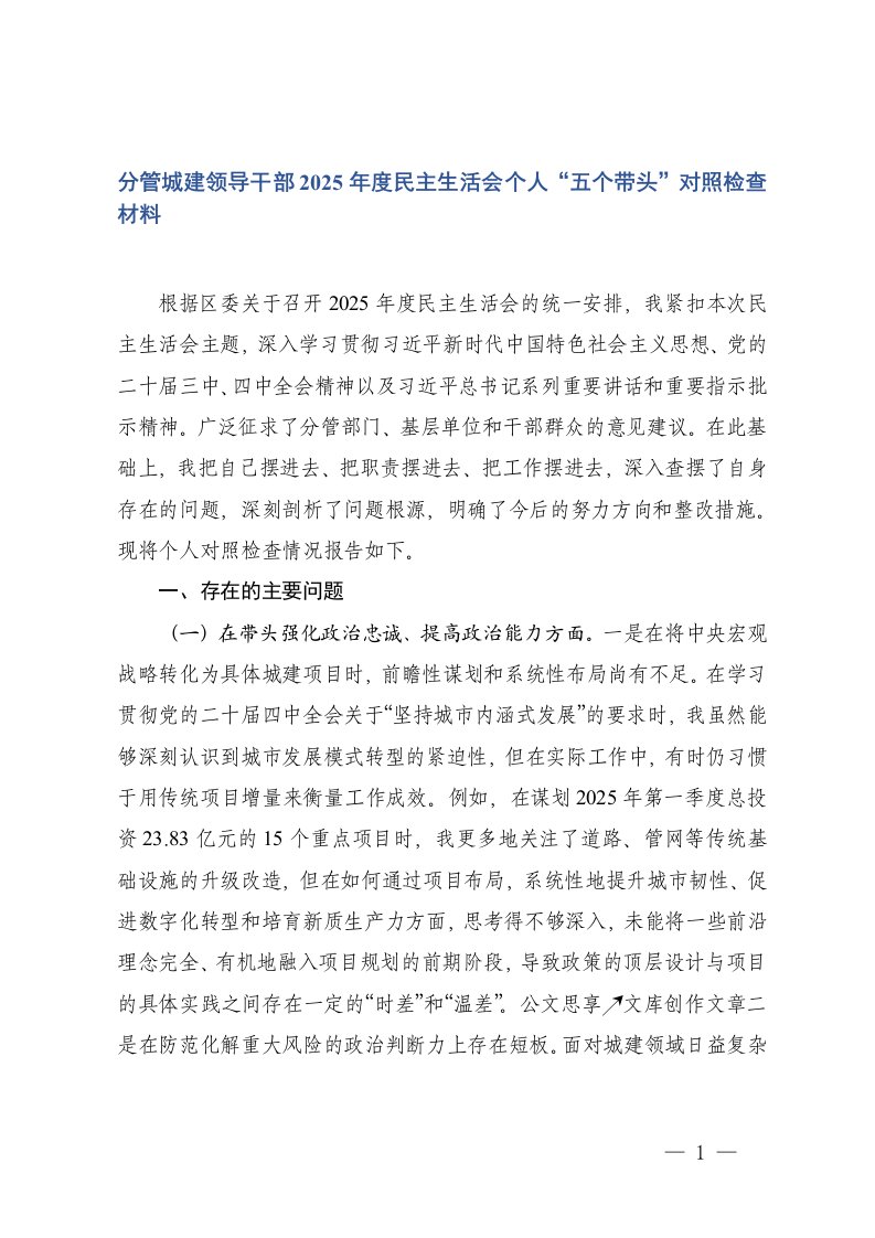 分管城建领导干部2025年度民主生活会个人五个带头对照检查