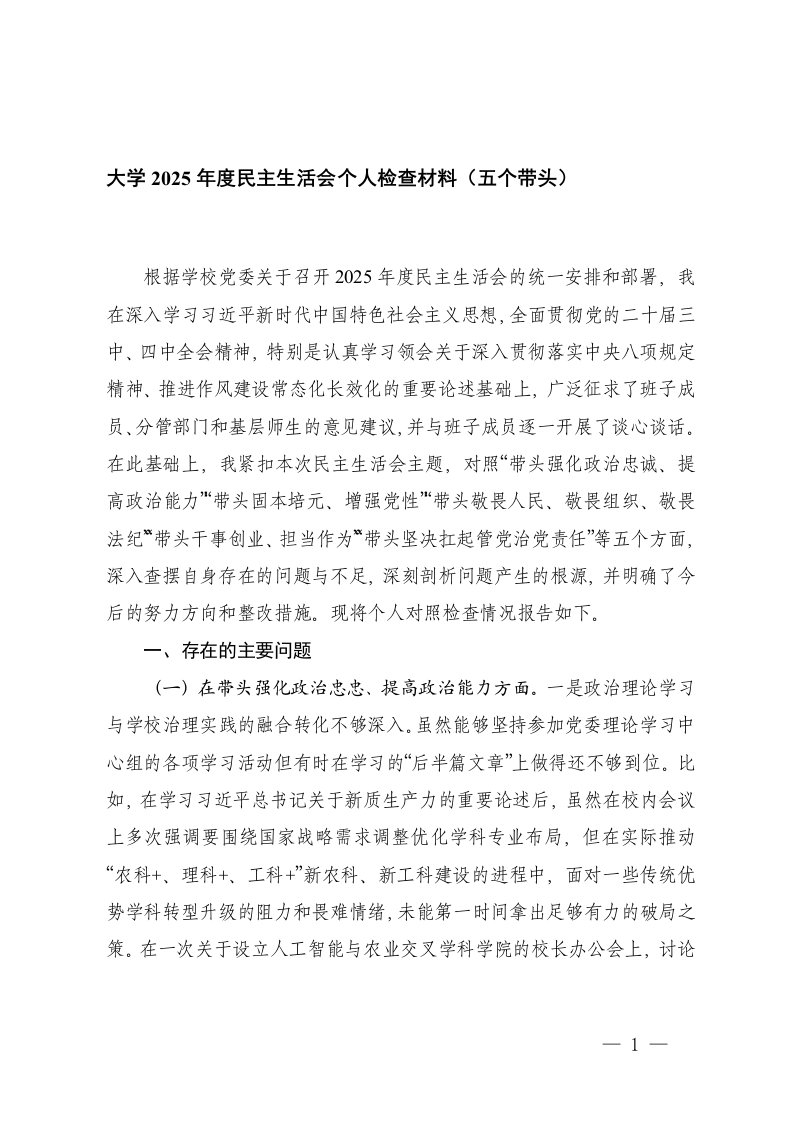 大学2025年度民主生活会个人检查